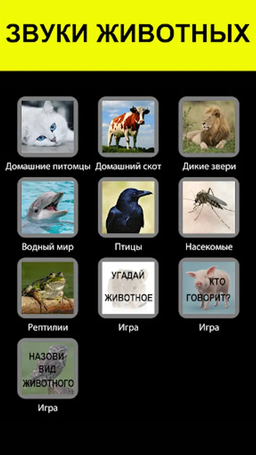 Animal Sounds is a fascinating journey into the world of voices of different animals and birds, wild and domestic animals and insects.