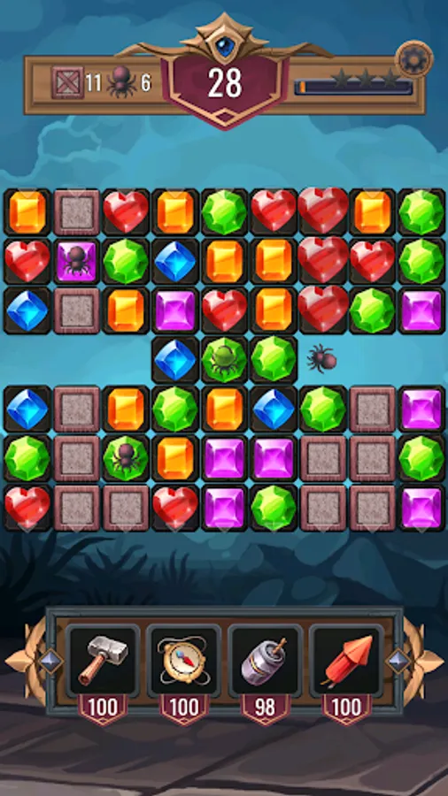 Rules of Diamond Dungeon are simple – to overcome various challenging logical levels and obstacles, you need not just mindlessly tap and match jewels, but use various puzzle match-3 mechanics and combine jewels into bonuses! By combining four jewels horizontally or vertically, you will receive the corresponding lightning bonus! And by combining five jewels you will get a bonus color!