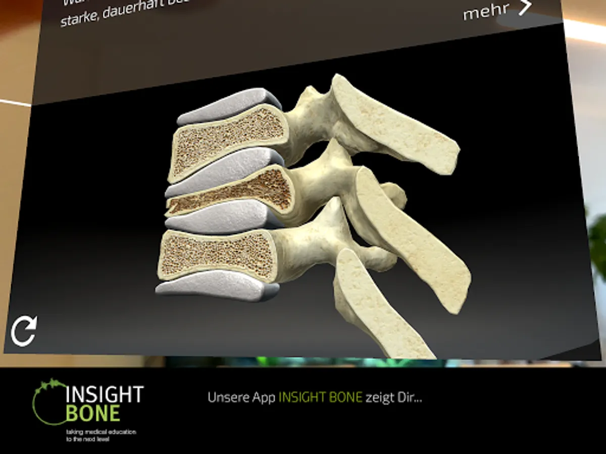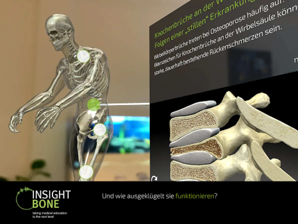 The augmented reality app INSIGHT BONE shows what is normally hidden: our skeleton and our bones. Visually impressive and scientifically founded, the structures in the body affected by osteoporosis come into the light.