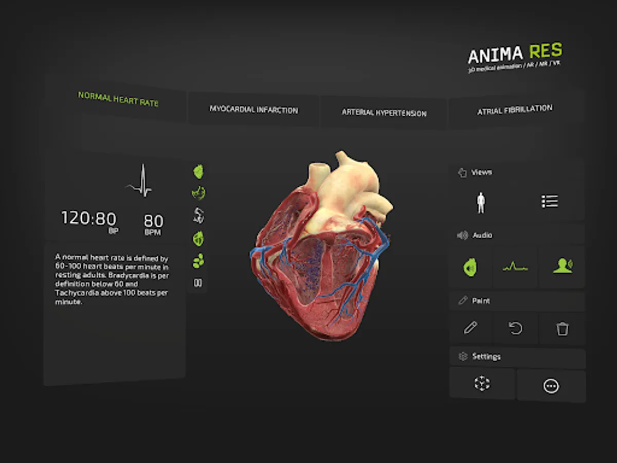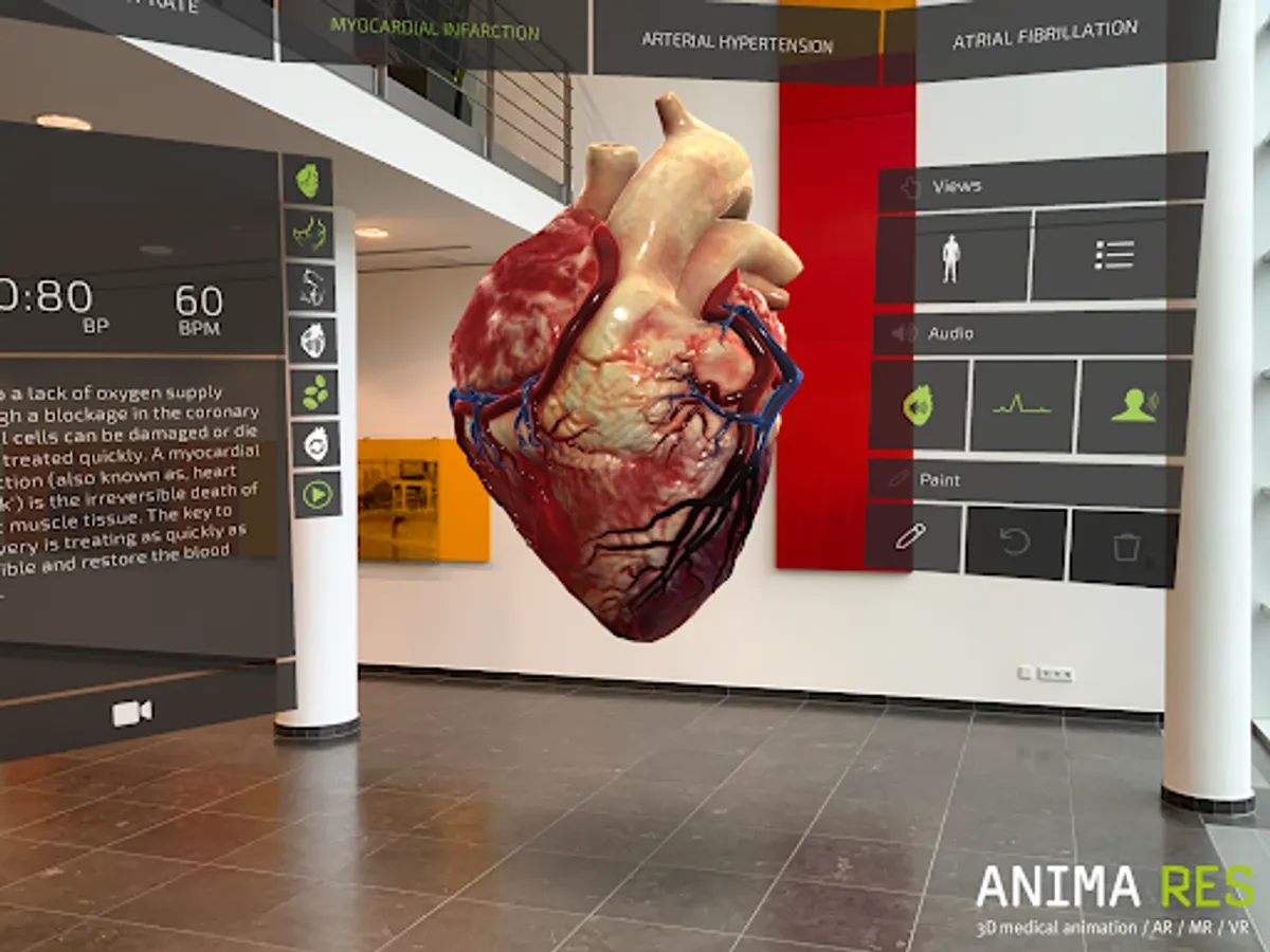 Trigger impressive visualizations of various conditions, such as normal heart rate, myocardial infarction, arterial hypertension, atrial fibrillation and dive into the detailed mode of disease of coronary artery disease and atrial fibrillation. Some of these conditions could never be experienced live!