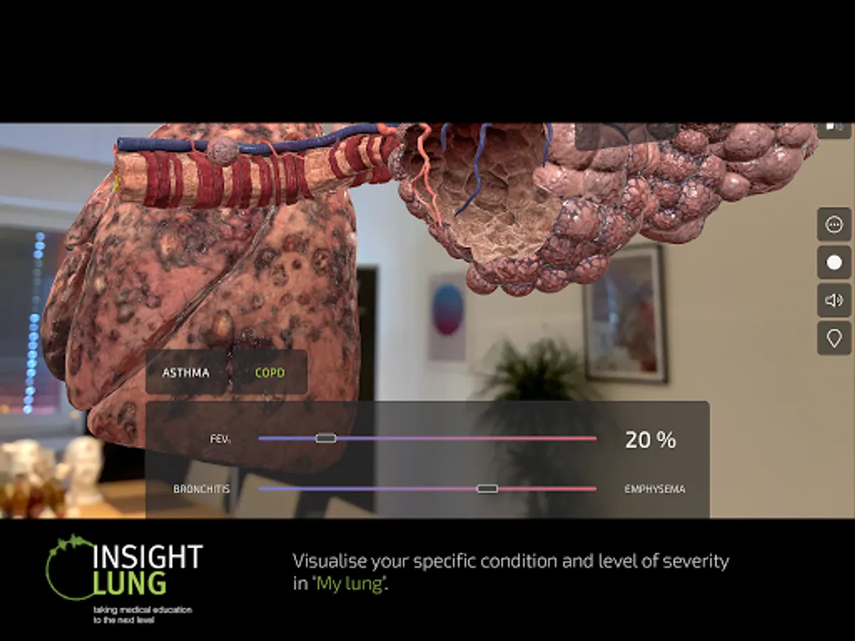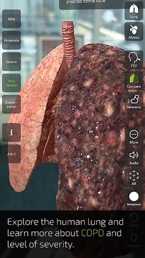 Trigger impressive visualizations of the healthy lung, asthma and COPD and visualize your condition and level of severity.