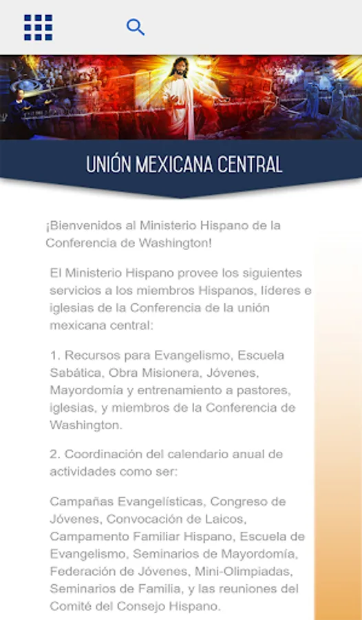 Evangelists campaigns Youth Congress Convocation of Laity, Family Camp, seminars Stewardship, Youth Federation, Seminars Family, information about upcoming events, and can also display the more nearby churches.