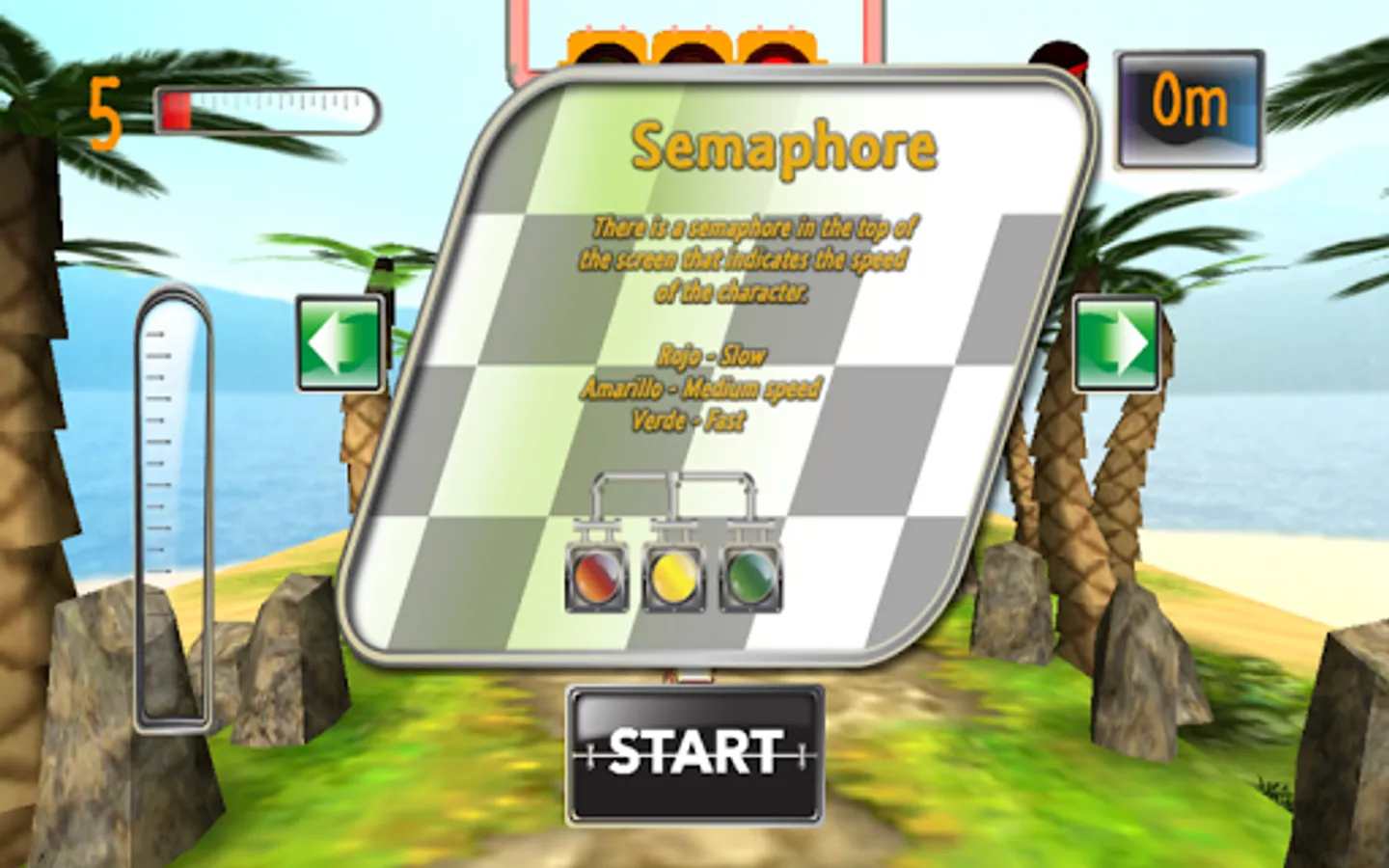 It presents a beach theme Where the character has to follow a path without falling of it or hitting the obstacles. The character Follows the instructions of a semaphore That Indicates the speed of the run.