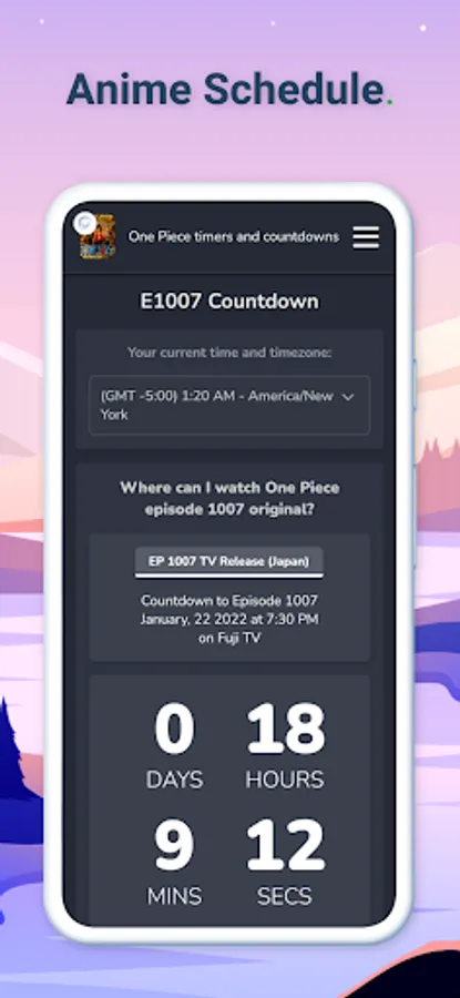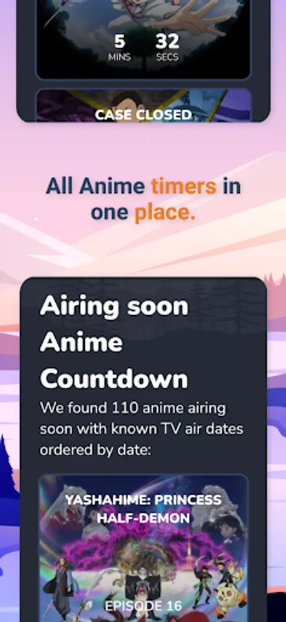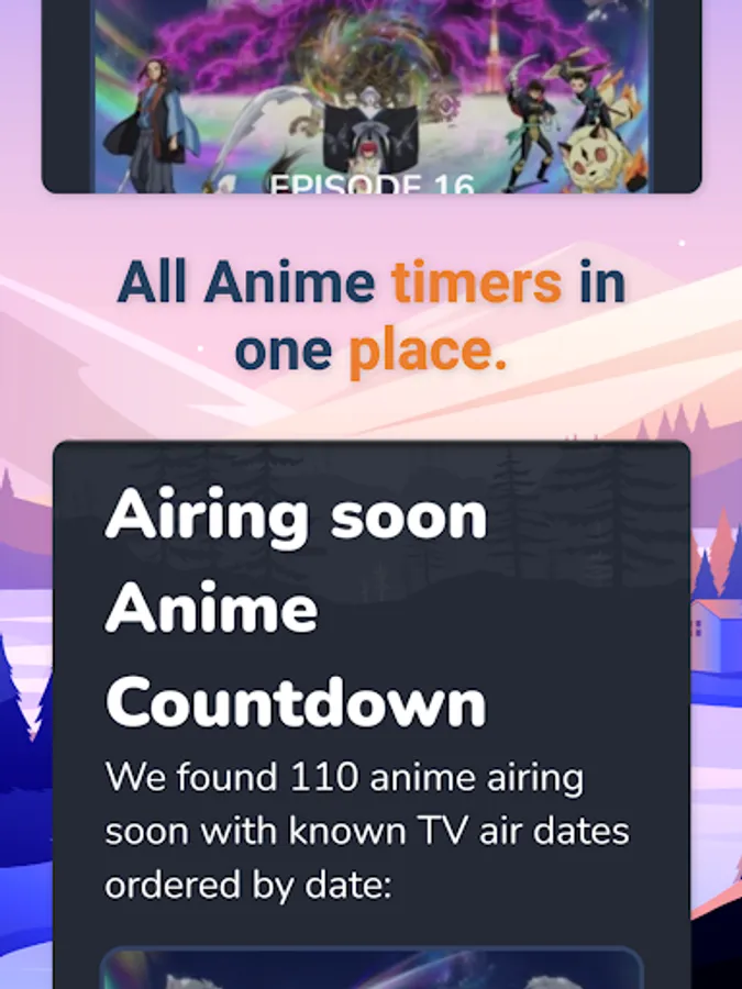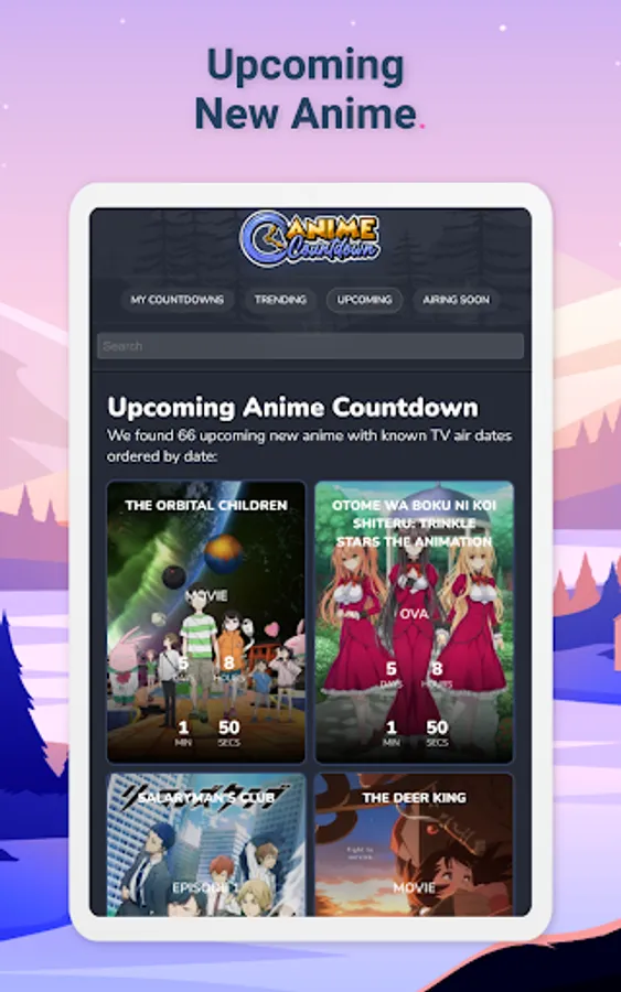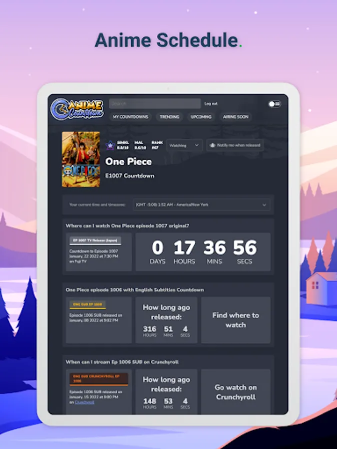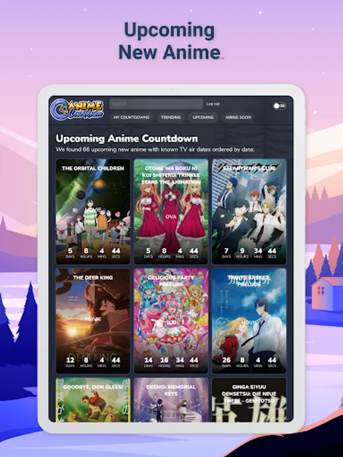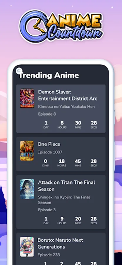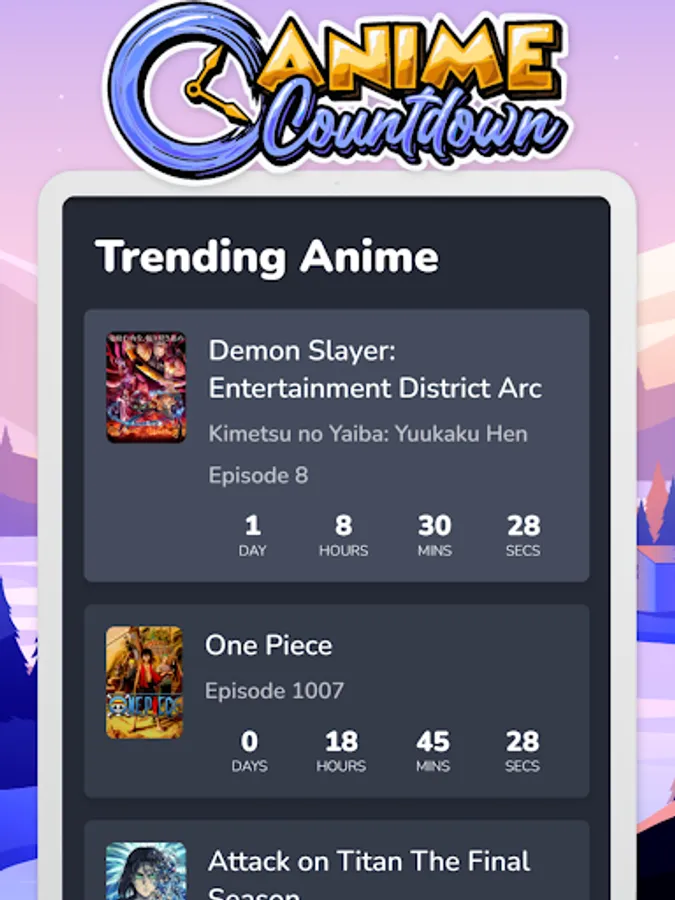 Anime Countdown, the ultimate app for anime fans! This app provides a countdown to the release of new anime episodes, so you can always be up-to-date on your favorite shows. Plus, you can check out the trending anime schedules and get excited about upcoming releases! Whether you're a hardcore fan or just getting started, Anime Countdown is the perfect app for you.