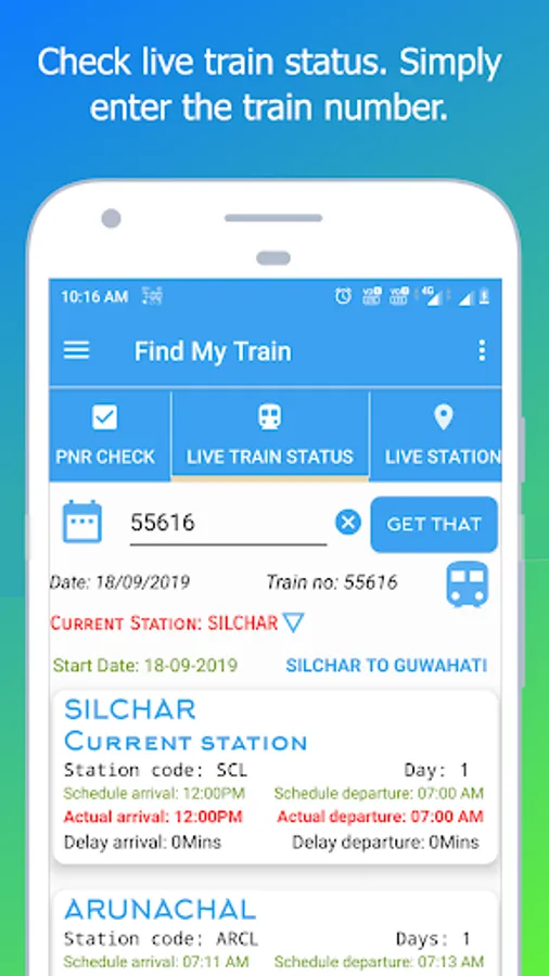 Type a train number whether it’s from PNR check or any random train number and get the current station name, where the train reached actual arrival, actual departure, schedule arrival, schedule departure, delay arrival or Departure time.