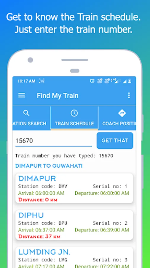 Type the train number and get the train name, schedule arrival time, schedule departure time, distance between station in Km.