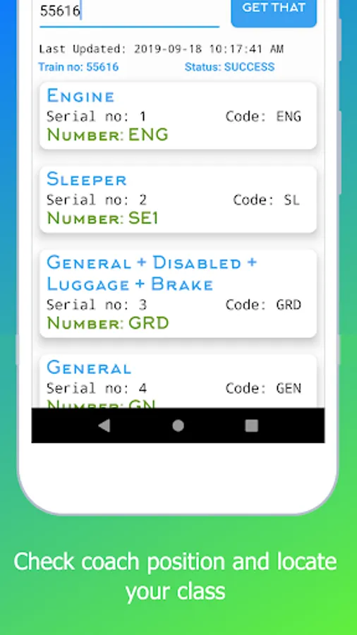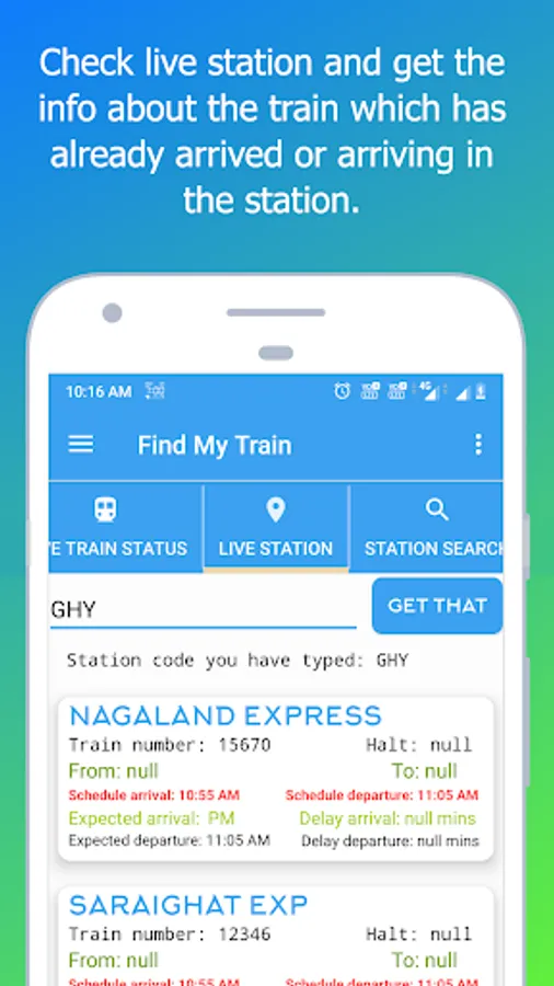 Don't know when the train will arrive or departure? No problem, simply type station code letters and get the info about the train which has already arrived or arriving in the station.