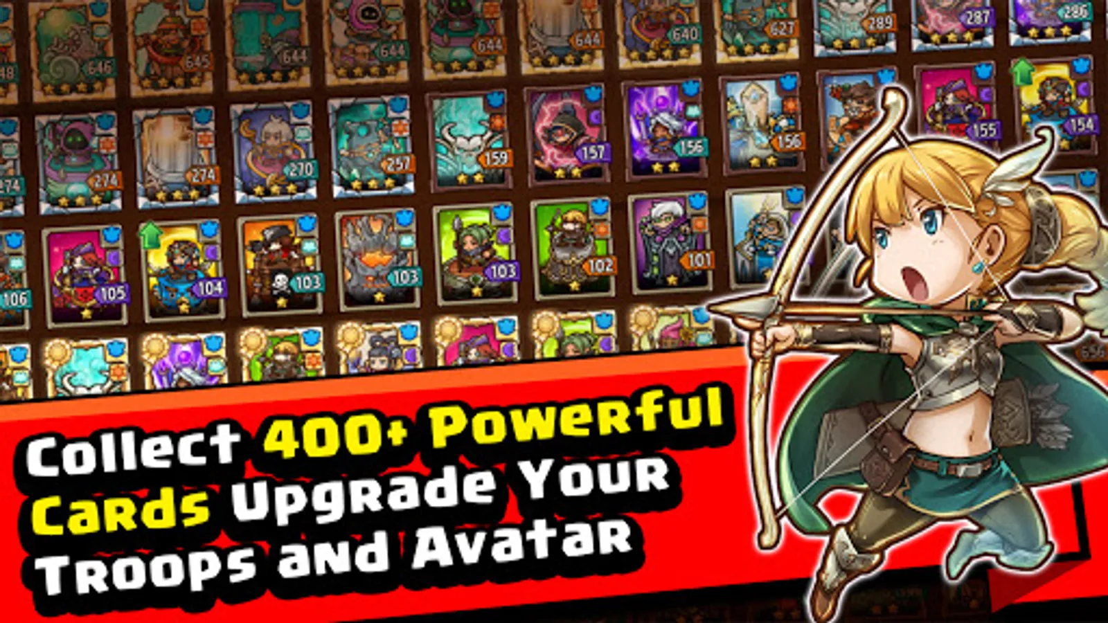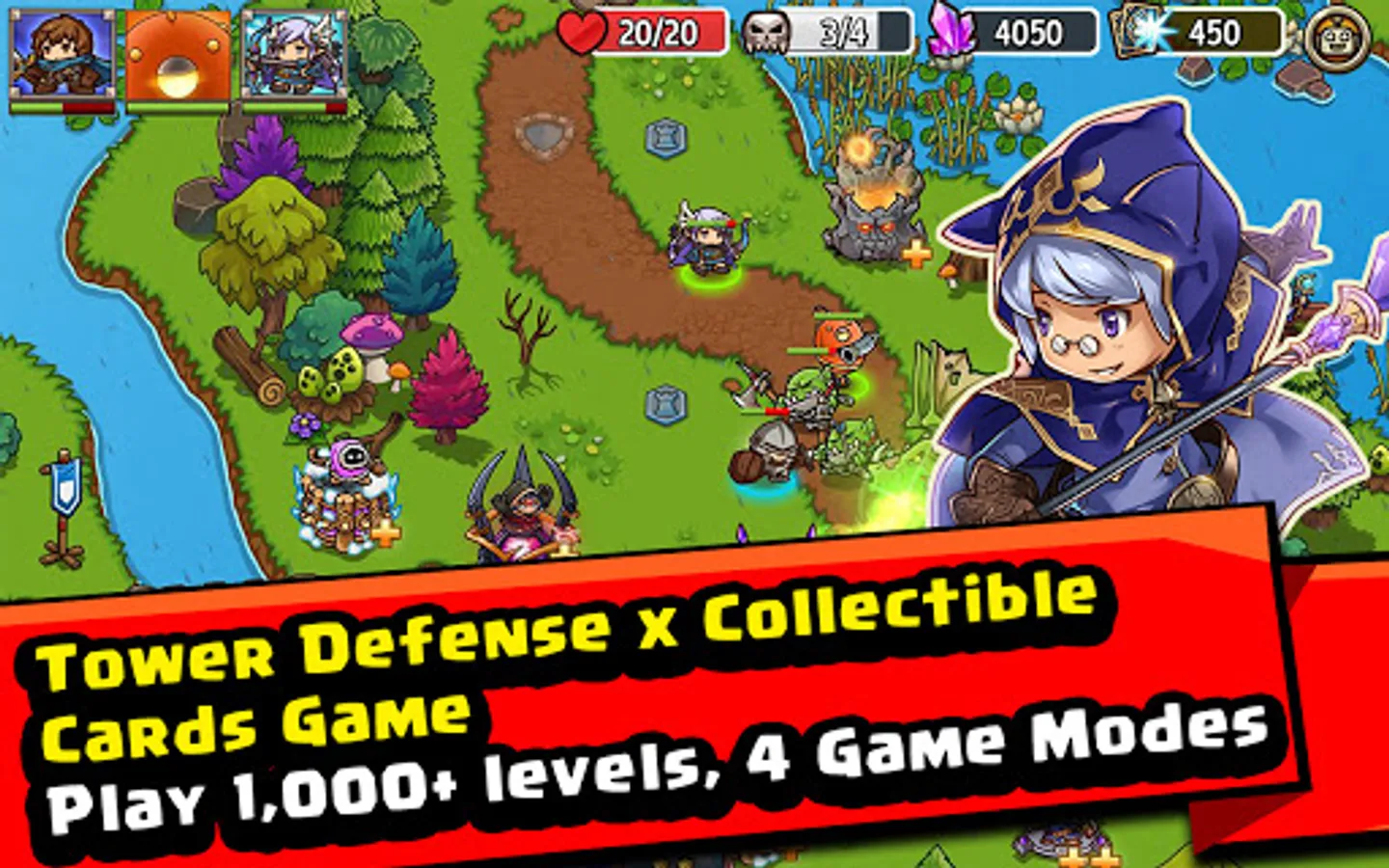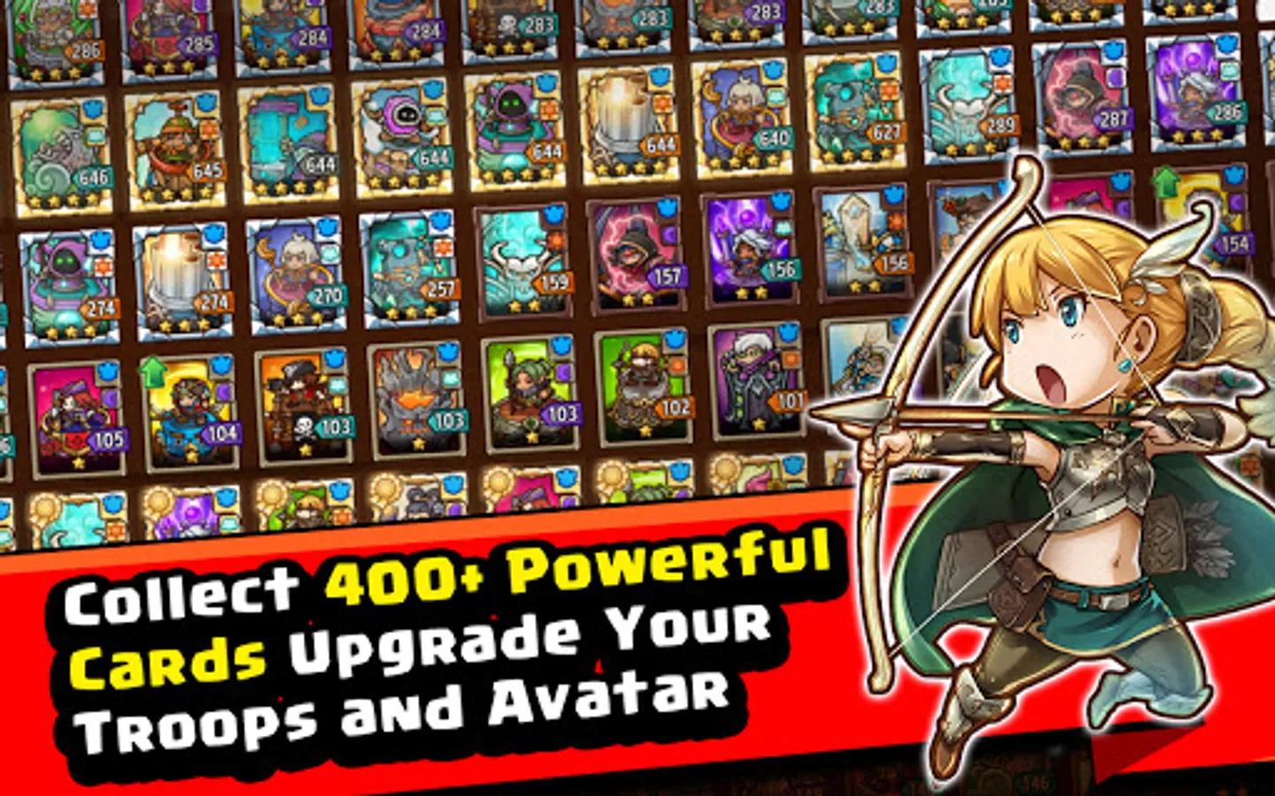 Develop your own defensive strategy by using an arsenal of towers and spells to defend you kingdom! Collect over 400 cards and combine Hero, Tower, Spell and Equipment cards to defeat boss battles. Command your hero and lead your army to victory in over 1,000 levels designed to provide countless hours tower defense fun!