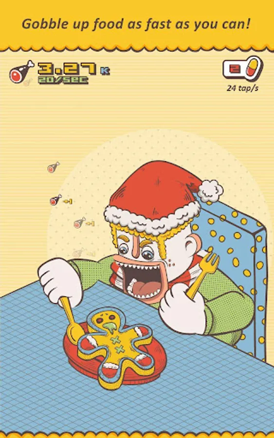 Help Leon, a jaded glutton, on his glorious adventure to find the cuisine that can satisfy his boundless appetite! Leon's only holiday wish is to eat tons of food! Undaunted by calories, Leon continues his epic feasting, piling on the pounds and layers of fat just in time to fight back against the winter chill! His appetite knows no bounds, and it's just a matter of time before he's gobbling up entire planets, the best present he could ask for! Will Leon ever find satisfaction?