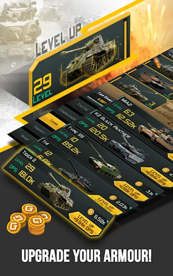 Tanks of iron and steel. Prepare your army for world war! Command, upgrade and level up your tank battalion, and click them into place with advanced tactics, in a new take on tap warfare!
