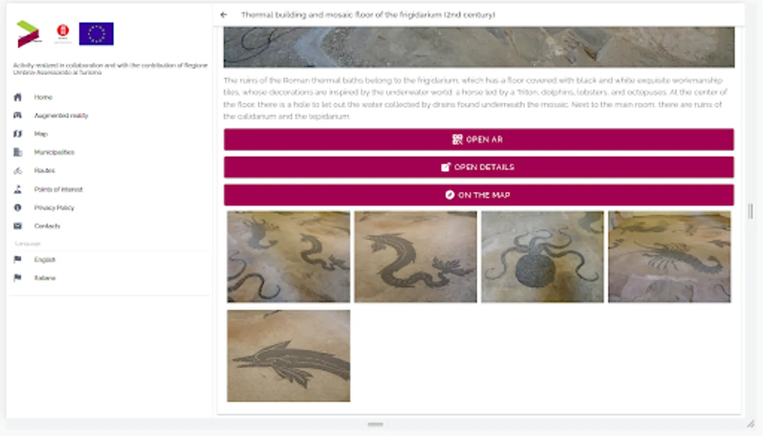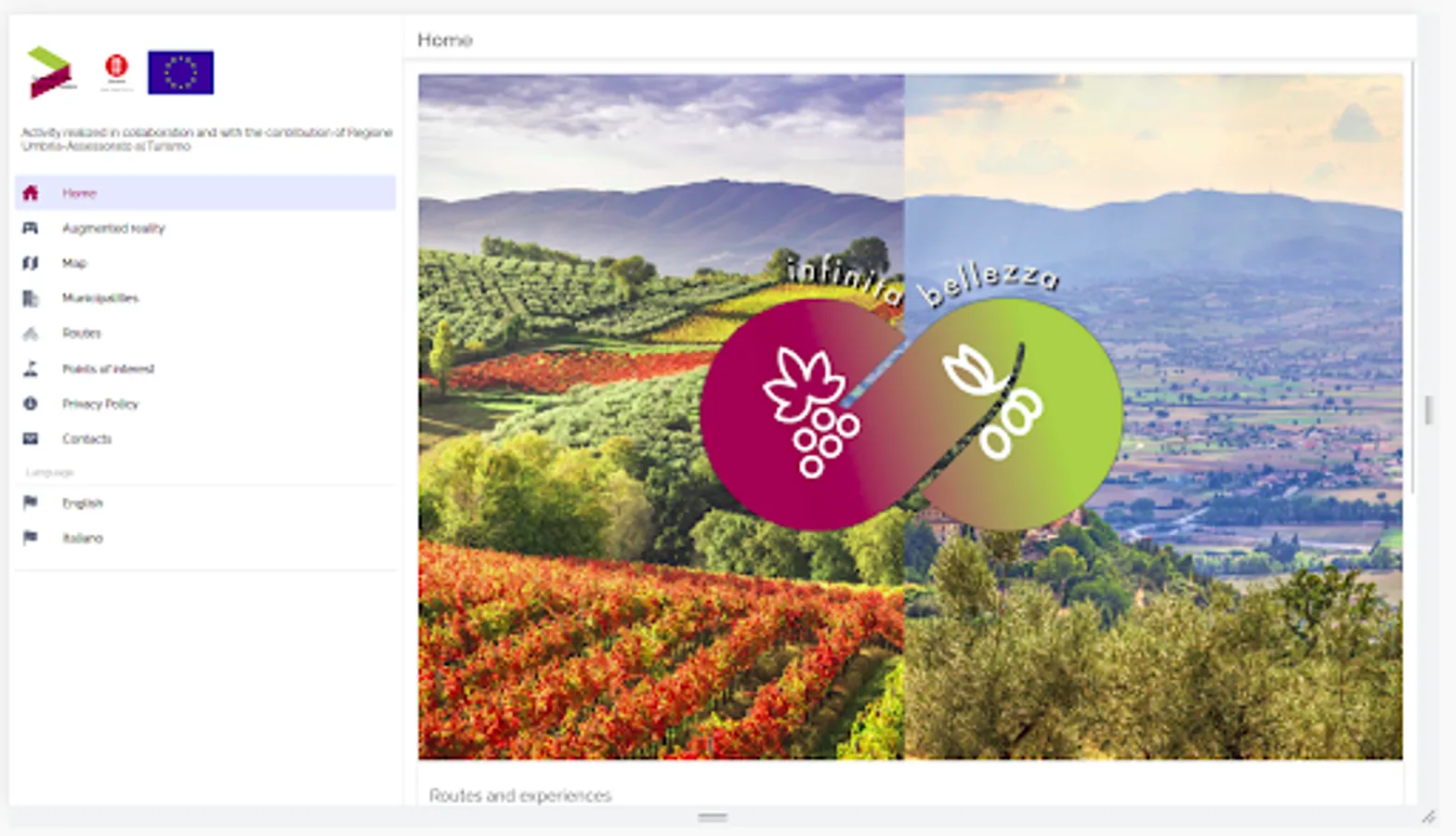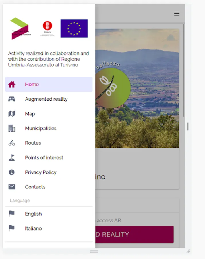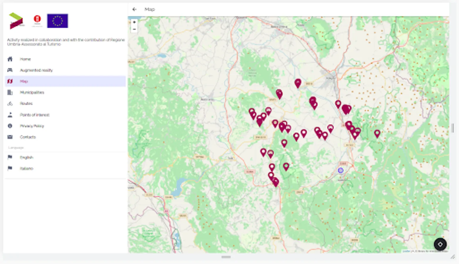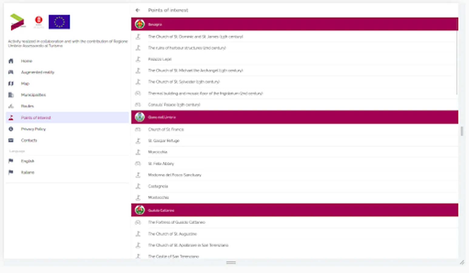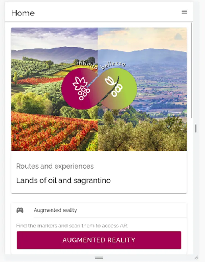 For each one of the eight municipalities of the Lands of Oil and Sagrantino, the app contains information on the main points of interest, and for some of them Augmented Reality contents.