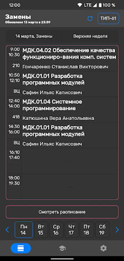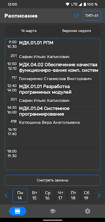 The MTKP Space app is the fastest way to find out about substitutions and daily schedules. Developer, student of one of the groups of the MTKP technical school at the Moscow State Technical University. N. E. Bauman, made sure that it was as relevant as possible for students, taking into account their habits and scenarios for checking replacements.