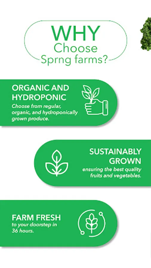 - Sprng farms app is extremely user friendly giving the consumer nutritional benefits of every product along with two recipes that are cooked using the particular product. From your login to final check-out, it's a super smooth hassle-free process.