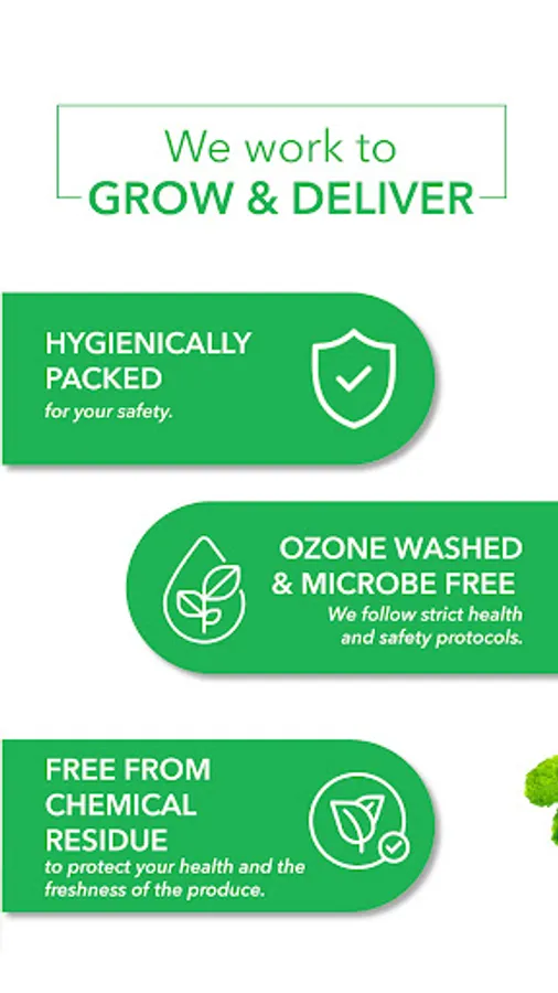 - Most of our products are grown hydroponically at our farms following a process of ozone washing, UV disinfecting each product and packed using the contactless delivery process. These products are delivered at your doorstep without you having to go out at competitive prices.