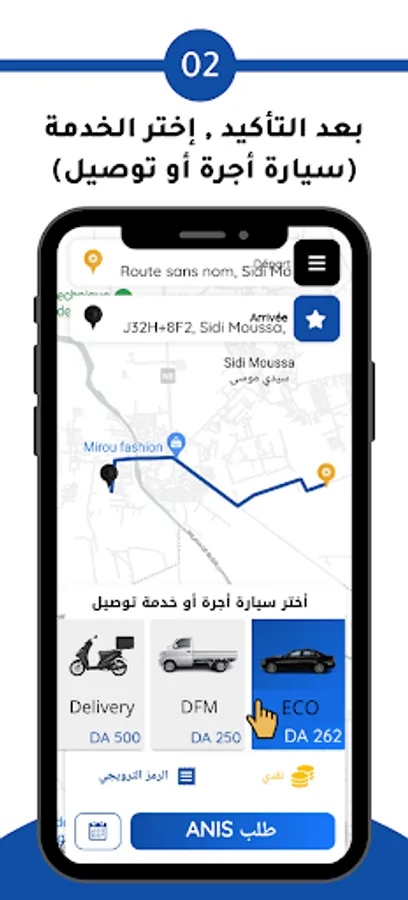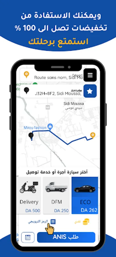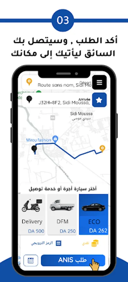 مع أنيس أطلب سيارة أجرة أو توصيل من هاتفك ، لتصل بسرعة من وإلى أي مكان .