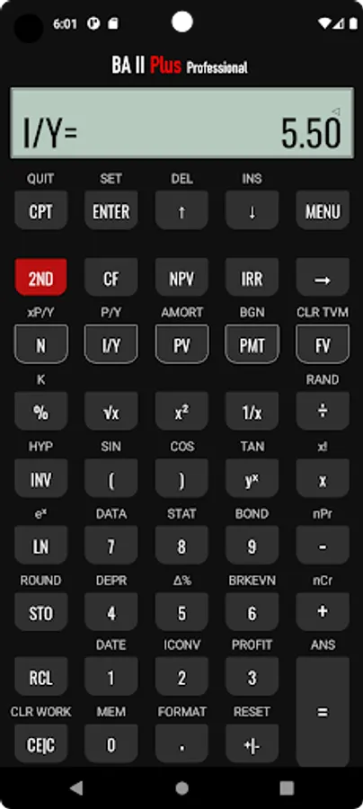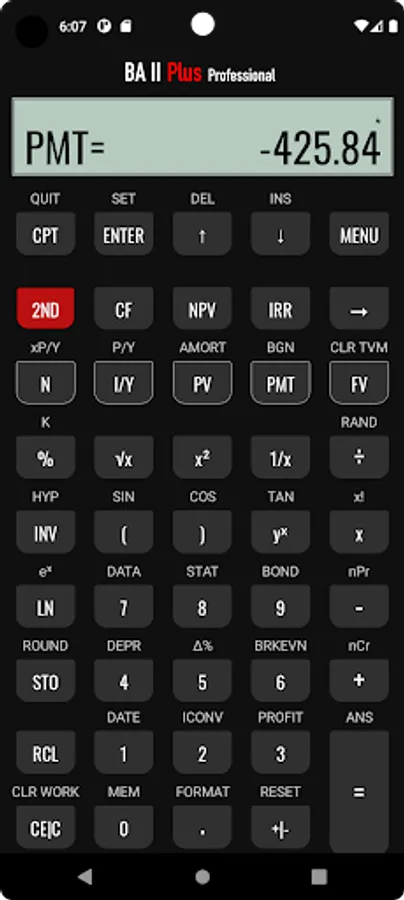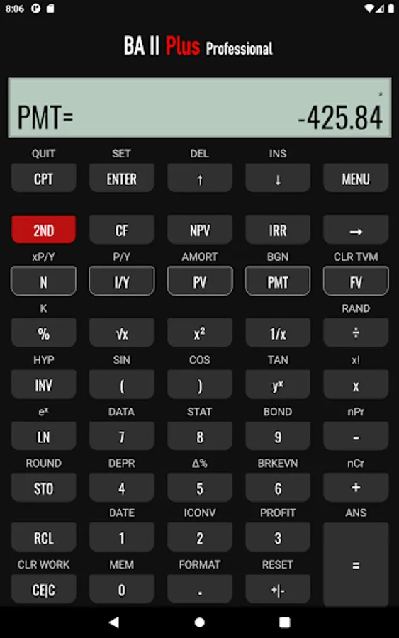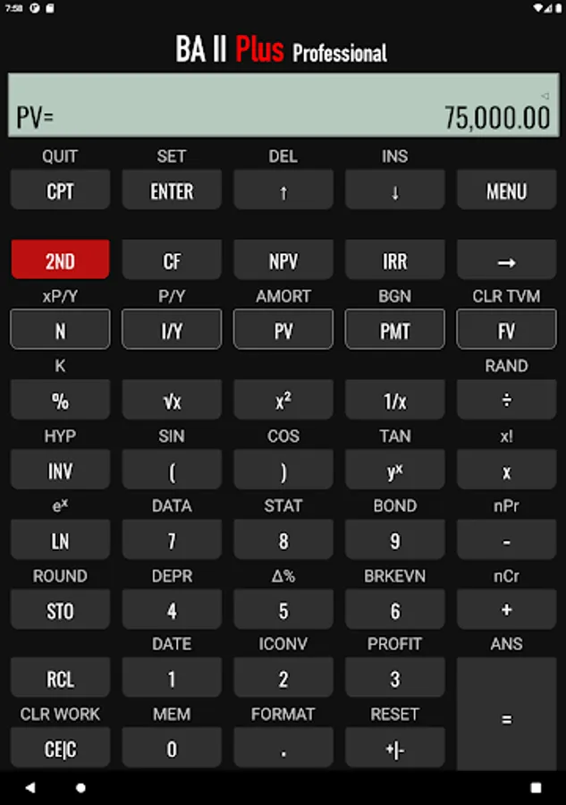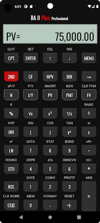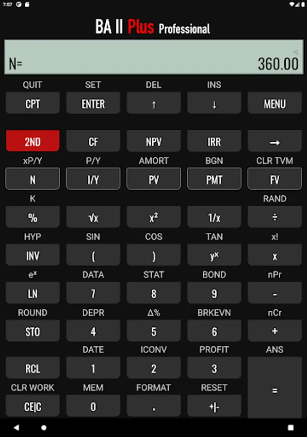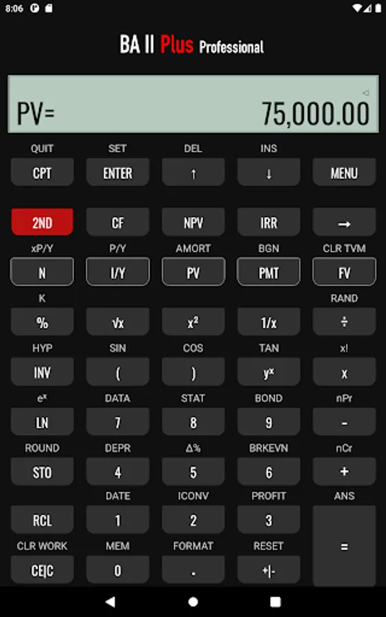 The BA II Plus Professional is a complete reimplementation of the full functionality of the TI's professional version of BA II Plus calculator. This free version provides basic Calculator functions, Math functions, Memory functions. A one-time In-App-Purchase required to access the Time-Value-of-Money (TVM), Amortization, Cash Flow, Bond, Depreciation, Statistics, Percent Change/Compound Interest, Interest Conversion, Date, Profit Margin, and Breakeven worksheets.