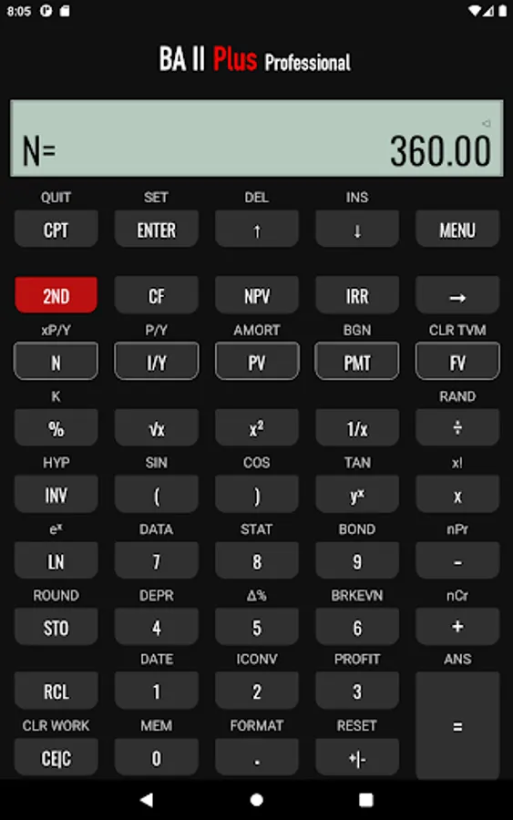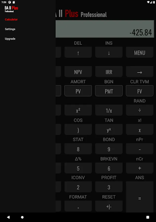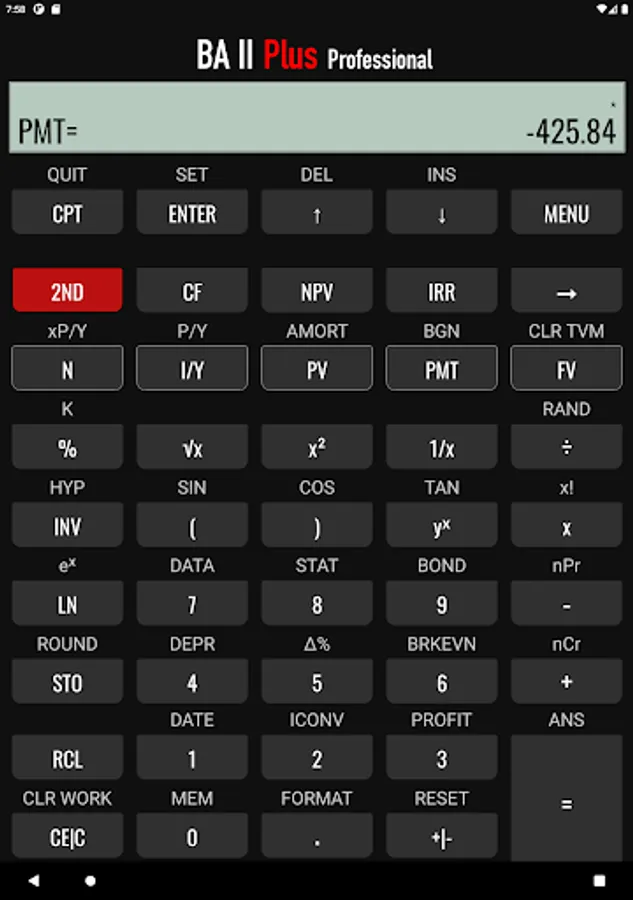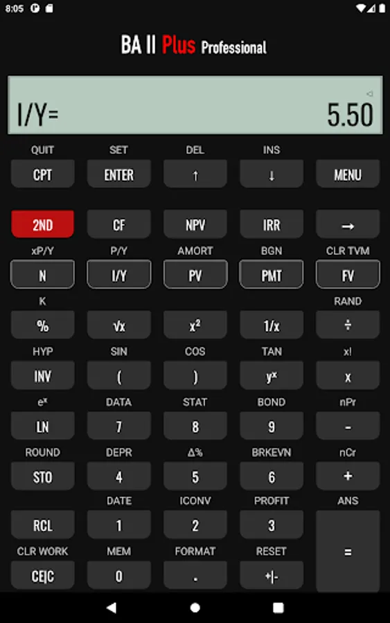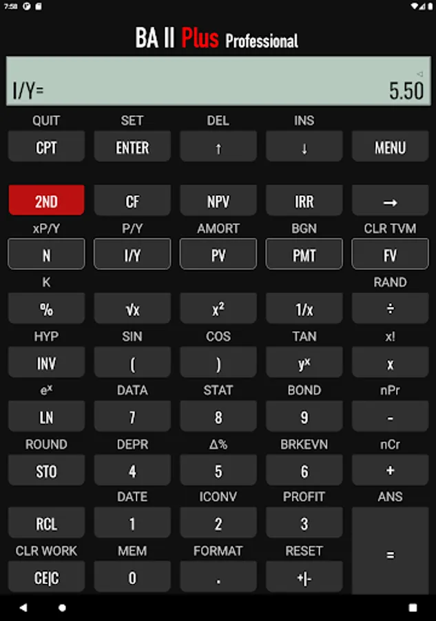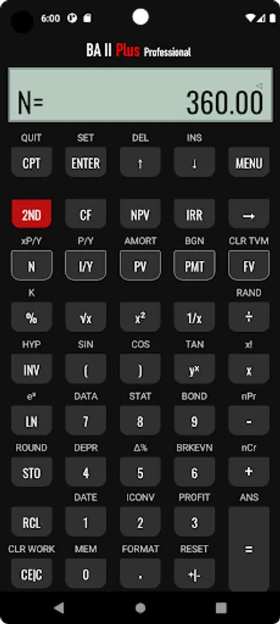 The BA II Plus Professional is a complete reimplementation of the full functionality of the TI's professional version of BA II Plus calculator. This free version provides basic Calculator functions, Math functions, Memory functions. A one-time In-App-Purchase required to access the Time-Value-of-Money (TVM), Amortization, Cash Flow, Bond, Depreciation, Statistics, Percent Change/Compound Interest, Interest Conversion, Date, Profit Margin, and Breakeven worksheets.