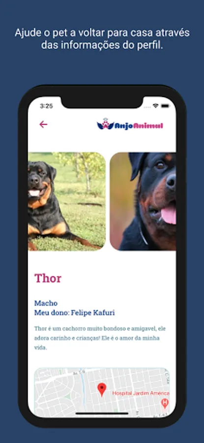On the tag (medal), placed on your pet's collar, the QR Code is printed, which when read by a smatphone, will show all the data of your PET, with identification, photos and data of the animal and the owner, as also your location. You can also access all data through a web browser.