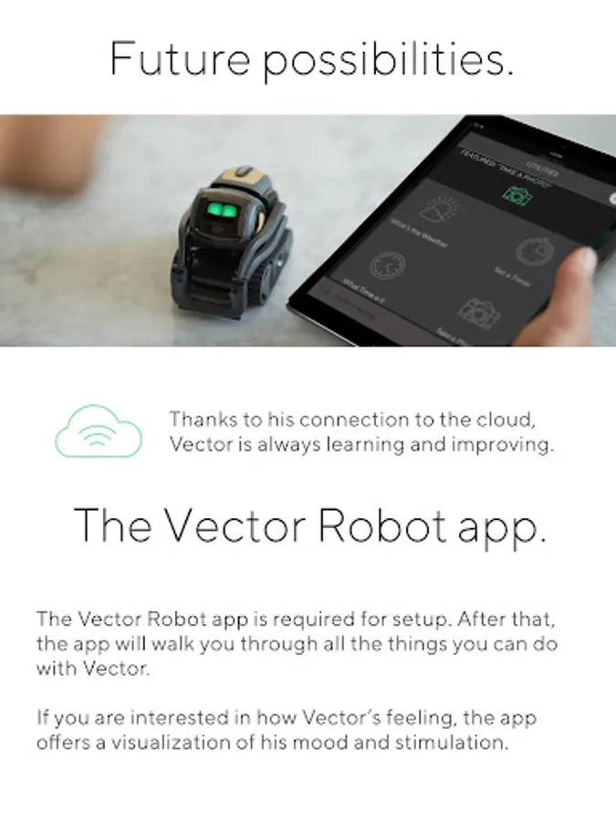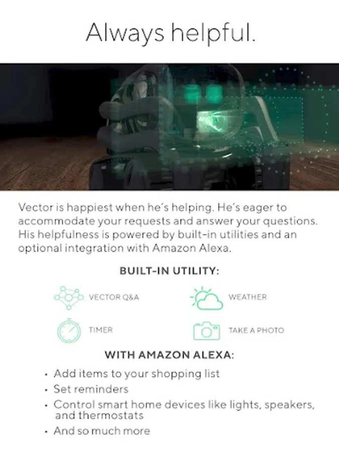 Vector is cloud connected and self-updates, so he’s always getting smarter and adding new features. He can even charge himself (electric cars and phones could learn a thing or two). Vector is your robot sidekick who’s up for anything.
