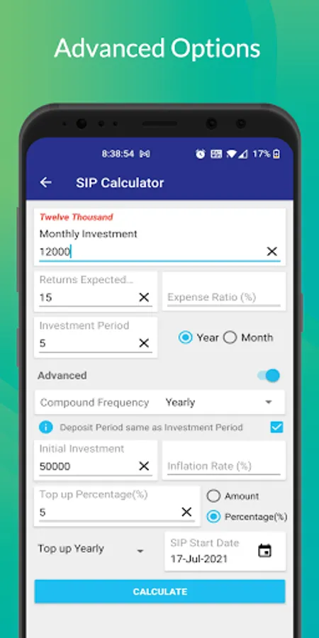 9) SIP calculator - it calculates the expected maturity amount basis your inputs on monthly investment, rate of returns , tenure inflation initial investment, and step up increment in advanced mode.