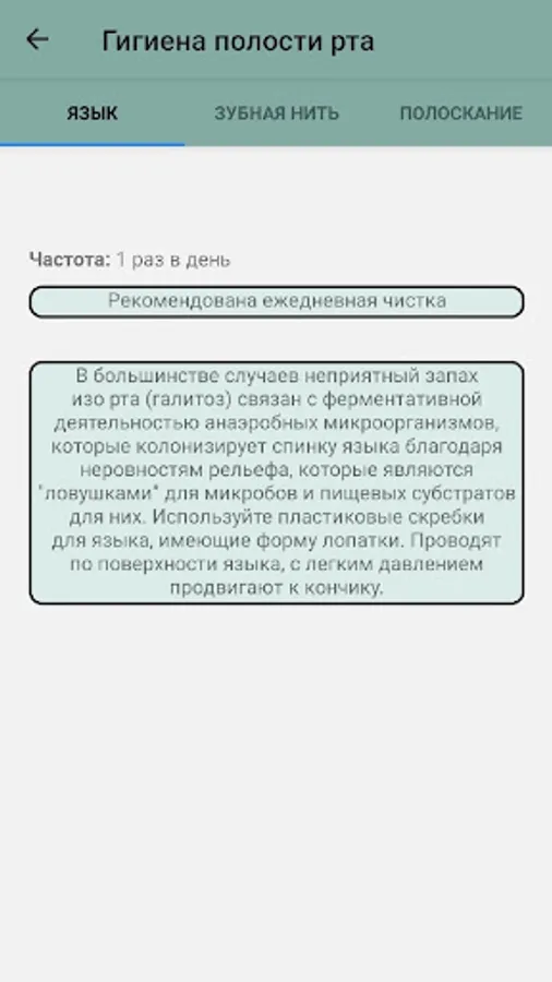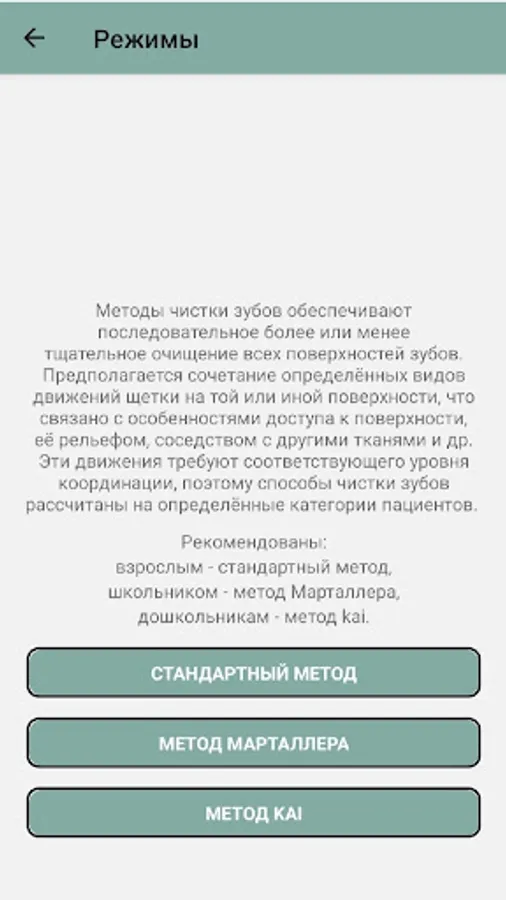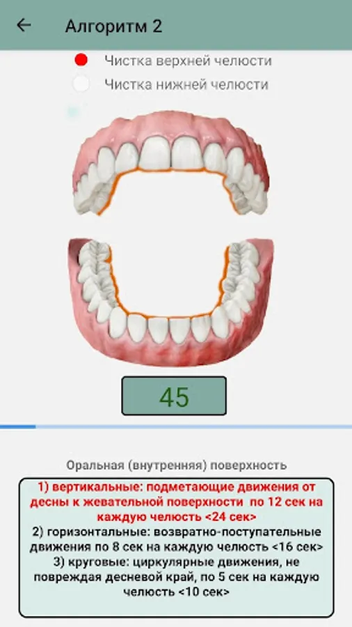 - this application contains clear and detailed instructions for brushing teeth according to the method that the user independently chooses, based on individual characteristics, age, etc.