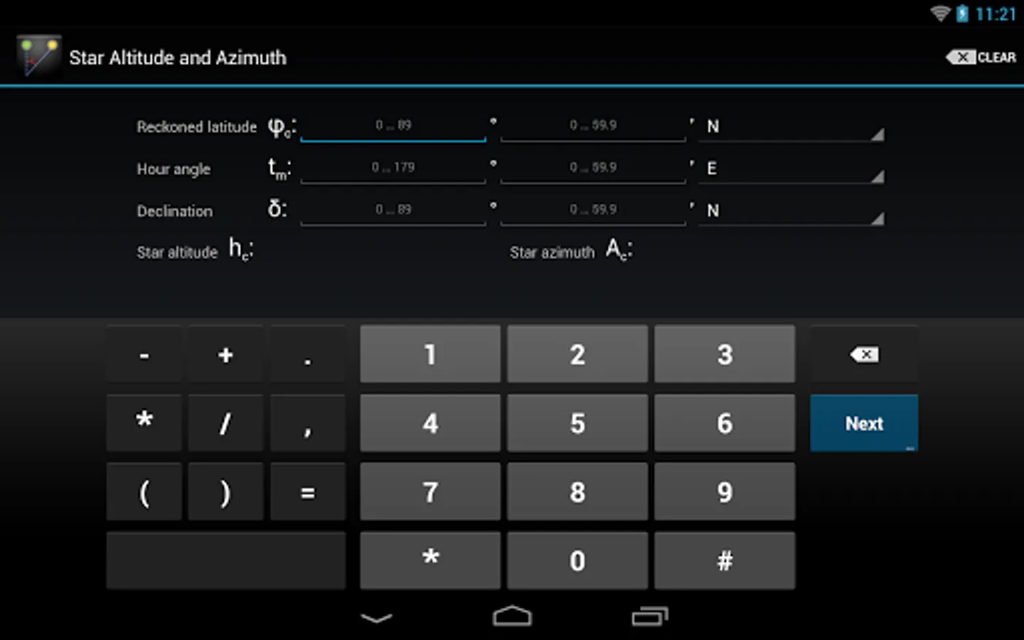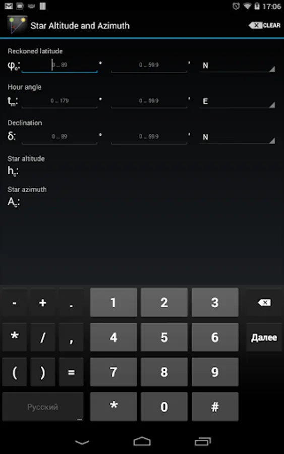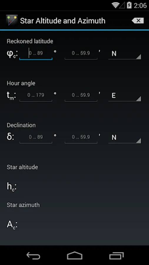 To find altitude and azimuth of a star, enter the following information: star declination (δ), local hour angle (tm) and reckoned latitude (φc). Each value is entered into two fields, degrees and minutes. Degrees for declination and latitude are entered in the range of 0 ° to 89 °, and for the hour angle in the range from 0 ° to 179 °, minutes from 00.0` to 59.9`, do not forget to select the appropriate name for the values in the drop-down lists.