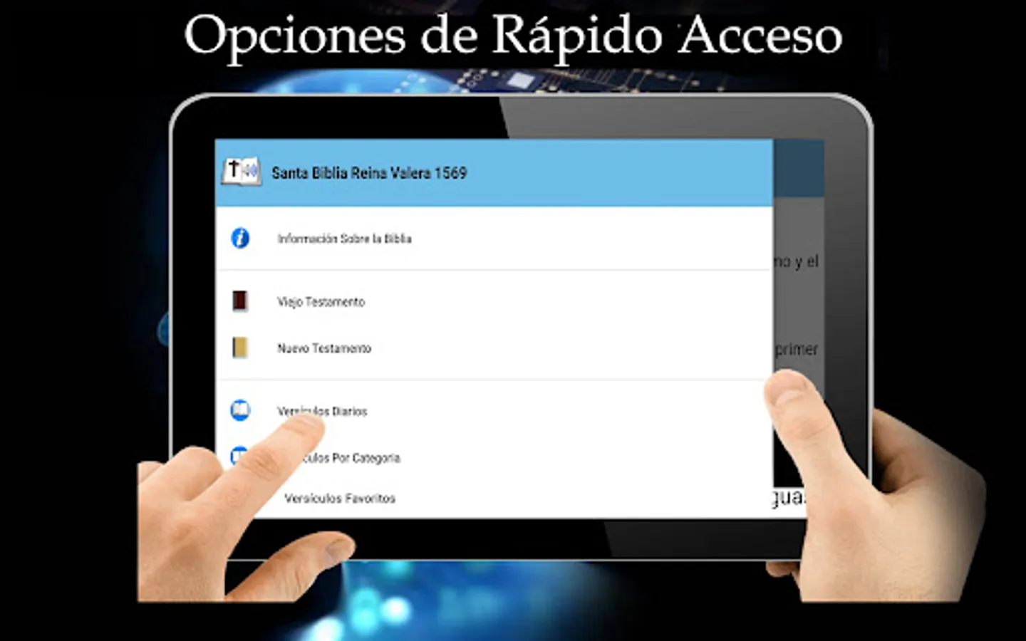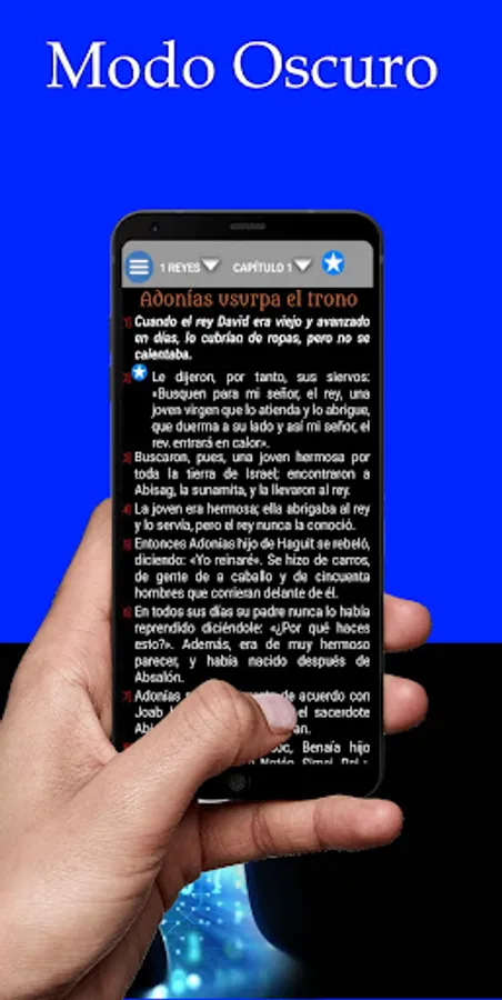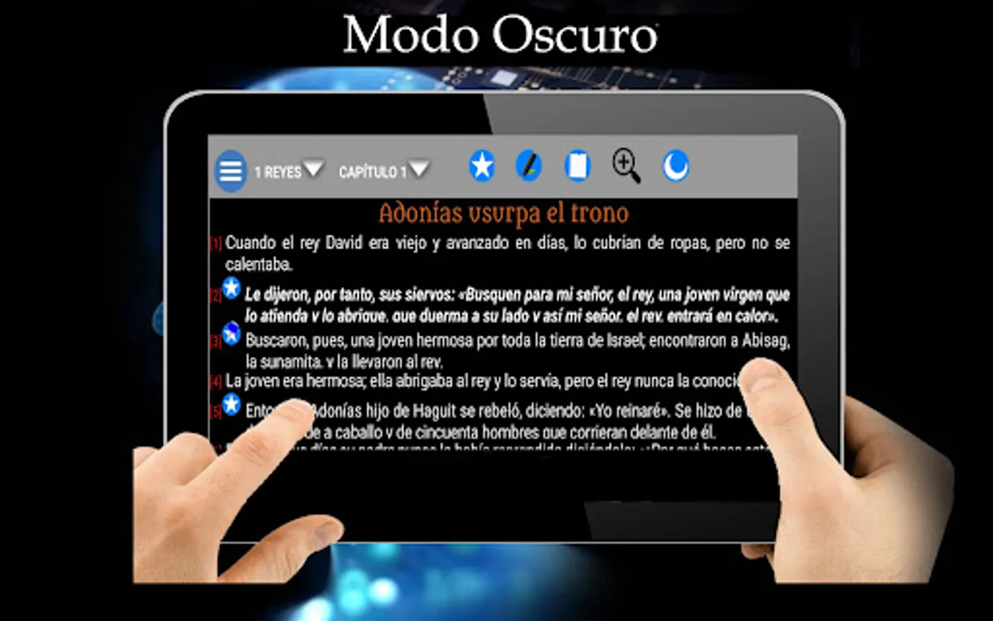 Access to the options menu quickly and easily. Option to change the text size. Book reading background change. Access to favorite chapters and verses. Search for words in the books, chapters and verses. Night mode to make reading easier and dim the screen light.