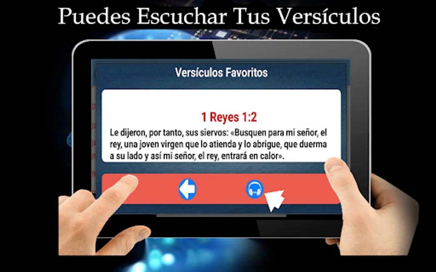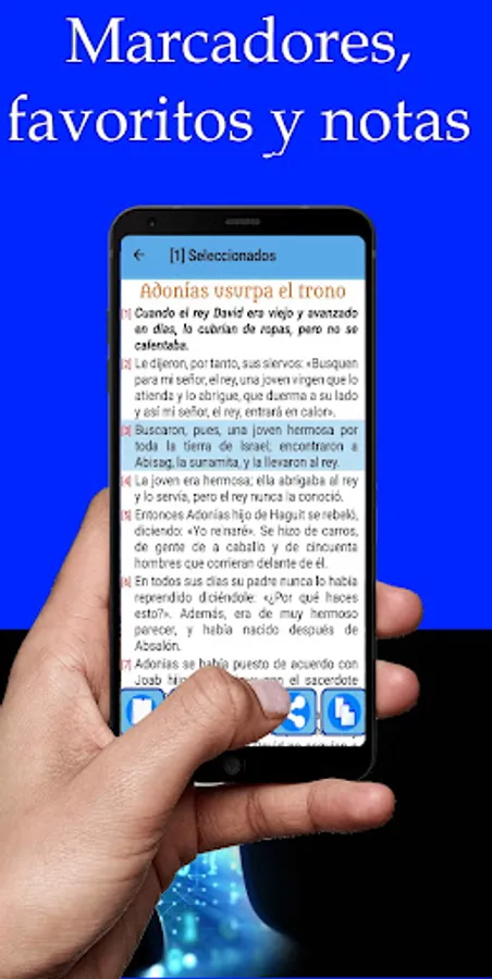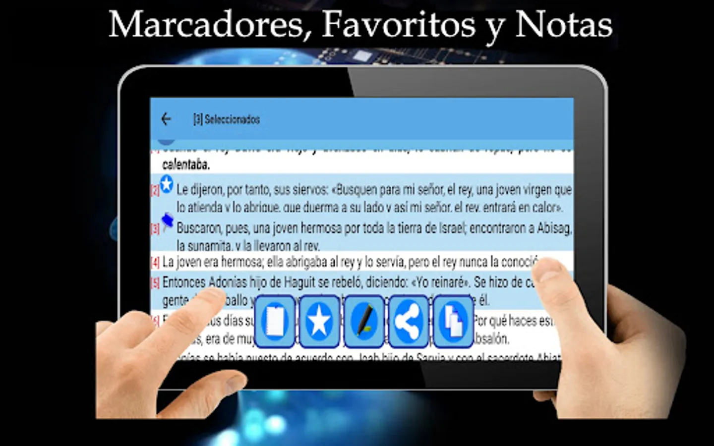 Puede seleccionar uno o varios versículos de un capitulo y marcar como favorito tambien puedes compartir con tus amigos los versículos en las diferentes redes sociales.