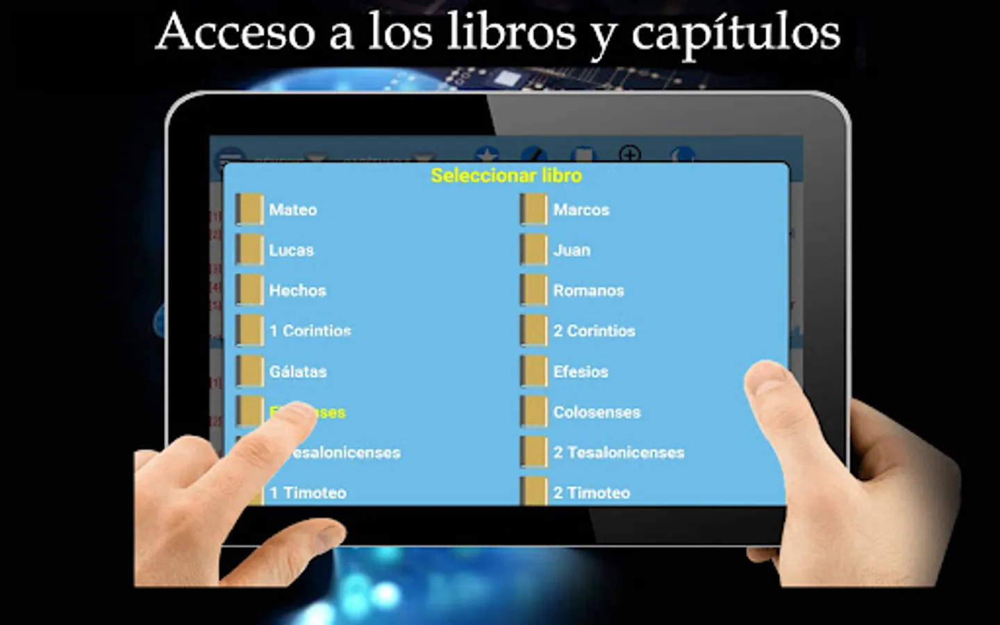 Usted puede hacer clic en la pantalla y la en la parte inferior aparecerá el nombre de libro y el capítulo, al presionarla aparecerá el listado de los libros y en la otra los capítulos que posee el libro seleccionado.