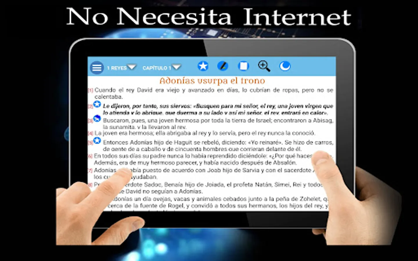 It is the book inspired by God and written by chosen and inspired men; to fulfill its purpose, in it we read about the character of God, his love, mercy and the plan that God proposed through his son Jesus Christ. the revelations of said plan for The Progress of mankind. The application is easy to use and allows you to read the scriptures quickly and conveniently, select a verse and save them as favorites. Access to the options menu quickly and easily. Option to change the text size. Book reading background change. Access to favorite chapters and verses. Search for words in the books, chapters and verses. Night mode to make reading easier and dim the screen light. Daily will notify you a verse. You can click on the screen and the name of the book and the chapter will appear at the bottom, when pressing it the list of books will appear and in the other the chapters that the selected book has. You can select one or more verses from a chapter and mark as a favorite you can also share the verses with your friends on different social networks. Clipping favorites shows the verses you marked for quick access. The Search menu will allow you to put a word in a text field and search the entire bible, in the old or new testament, If you specify the search range it may take less time to find matches, but if you select the entire bible it will take longer. find the results. Settings will allow you to change the font size and reading mode (Night and Day). The Holy Bible Application (NIV) New International Version is considered an efficient tool for the study of the word of God.