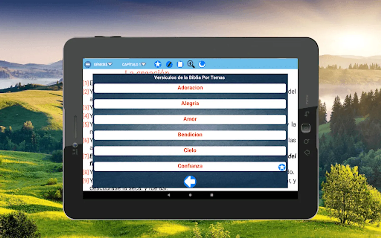 The Search menu will allow you to place a word in a text field and search the entire bible, in the old or new testament, if you specify the search range it may take less time to find matches, but if you select the entire bible it will take longer to find matches. find the results.