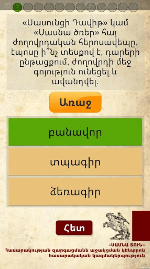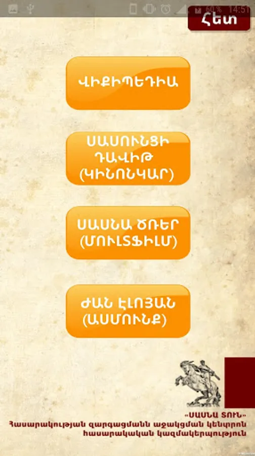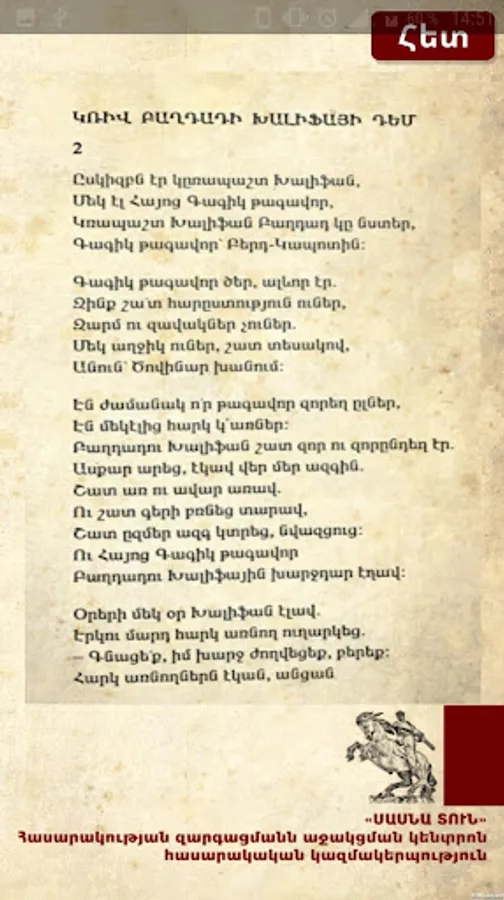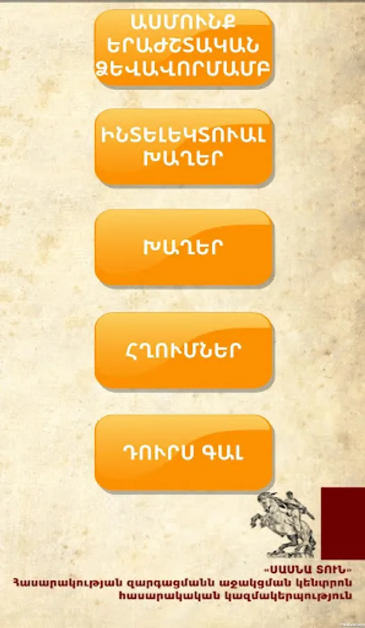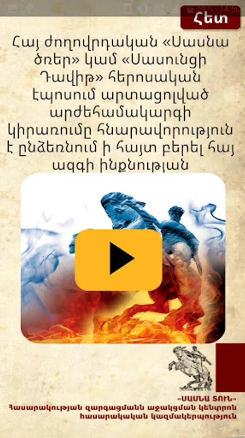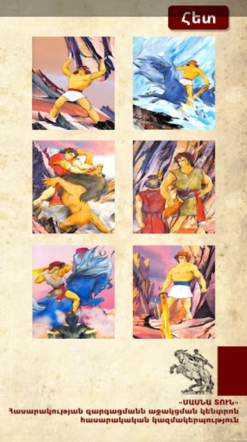 The application is intended to further popularize the Sasunci Davit epic and introduce it to all the nations around the world. It is designed for people of all ages.