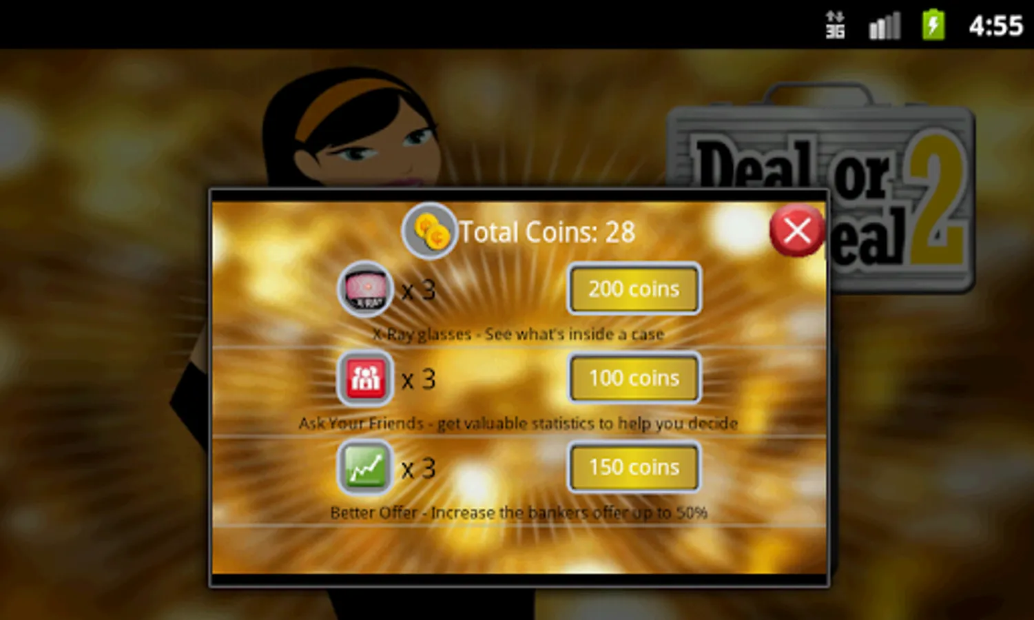 - Multiple power ups, such as "X-ray" , "Better Offer", and "Friends Advice"