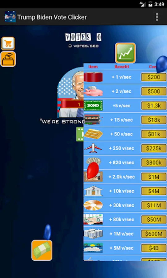 Want to earn votes without tapping? Buy investments such as stocks, gold, factories, slot machines and more!