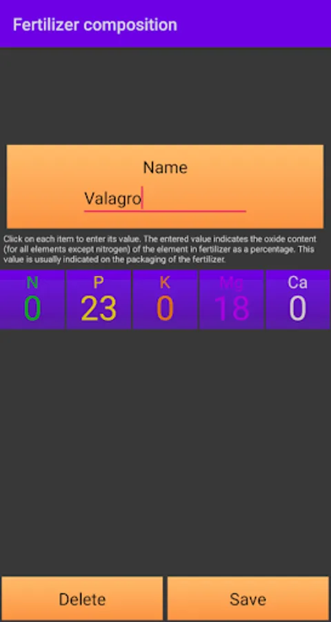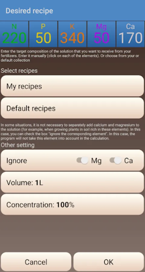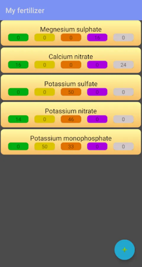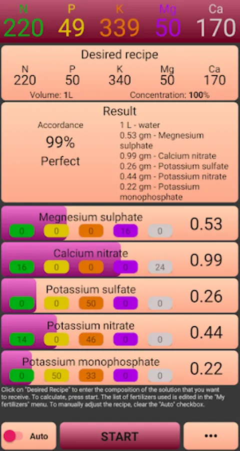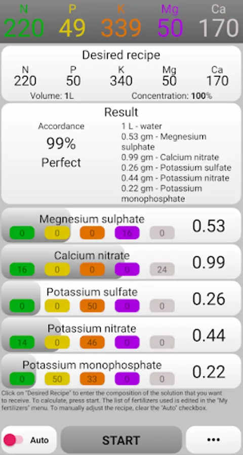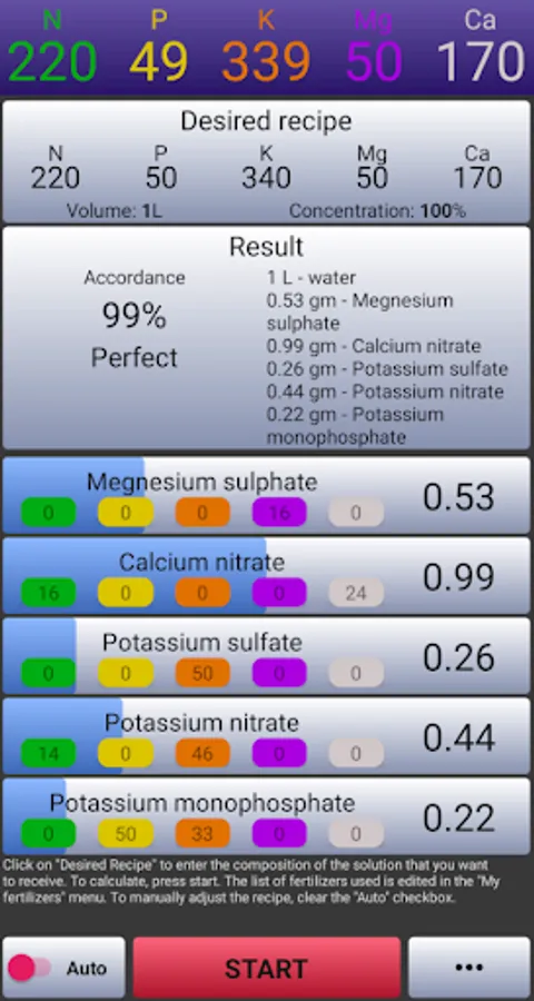 You simply enter your fertilizers and indicate the desired recipe for the solution. The calculator automatically determines what fertilizer and how much to take to get the desired composition.