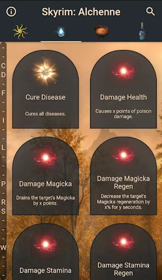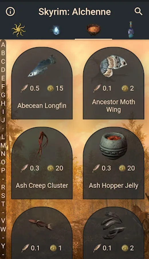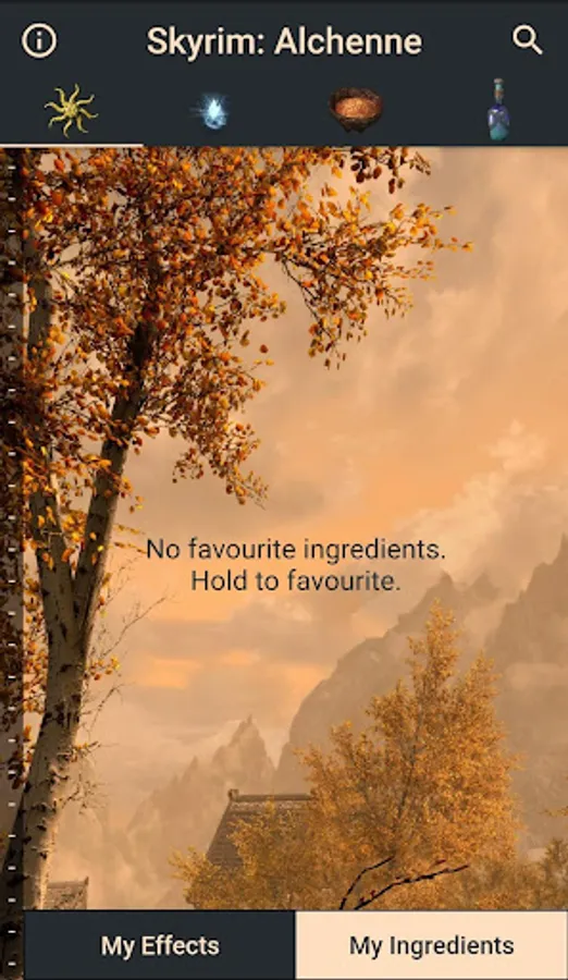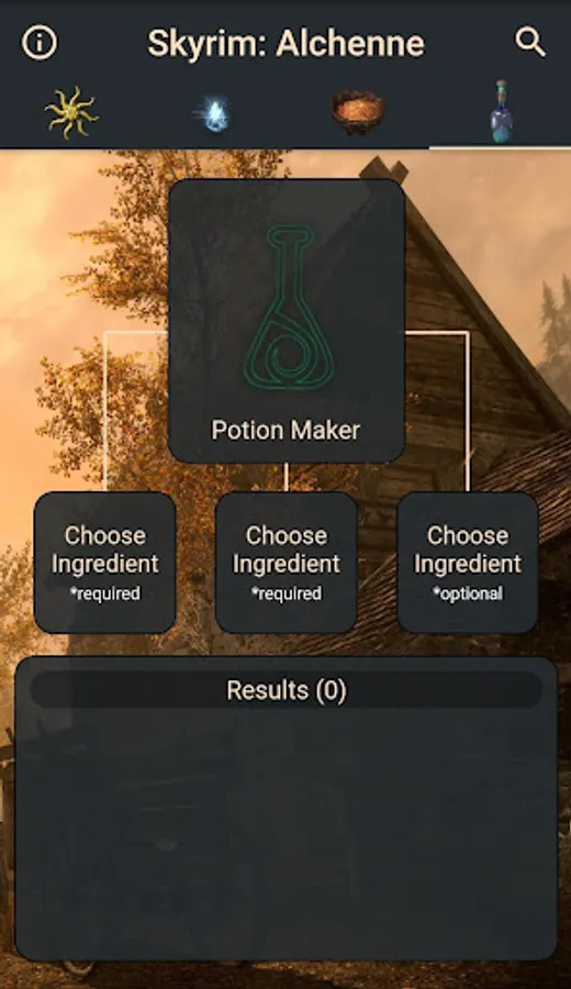 The Elder Scrolls V: Skyrim is an action role-playing video game developed by Bethesda Game Studios. The game provides multiple skills that the player can develop during gameplay. One of them is Alchemy, a skill that takes time to increase due to the constant search for specific ingredients and their possible effects. This is where Alchenne comes in, an application that serves as a source of information about potions, effects, ingredients and their locations from Skyrim and it's DLCs: Dawnguard, Hearthfire and Dragonborn.