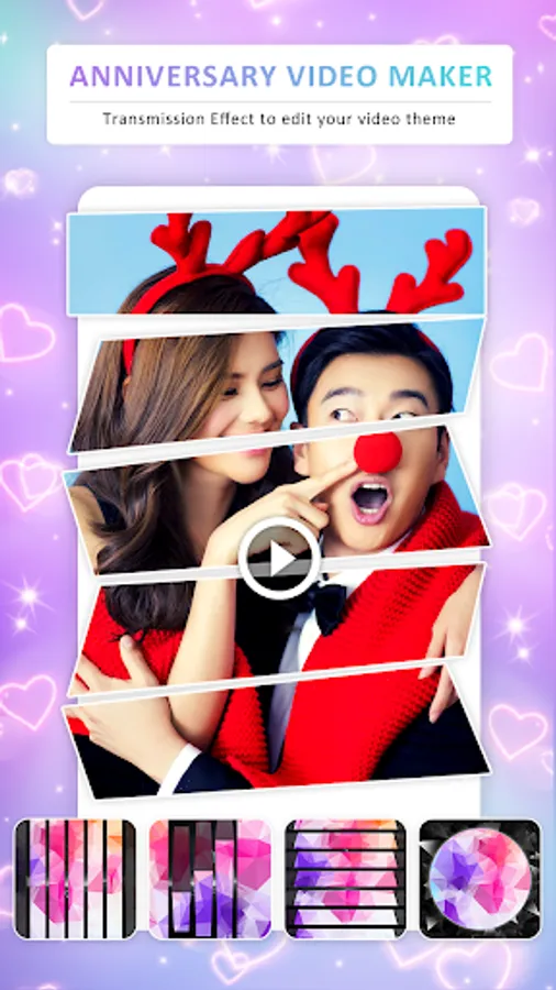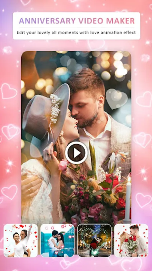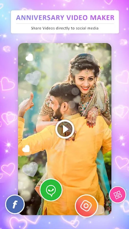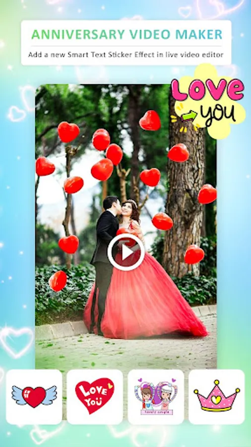 Most preferred app to make happy marriage anniversary slideshow effects movie or short status from selected images with personalise music audio editing option with HD Anniversary Themes of Heart Shapes and various sticker like Gifts, Love Emojies, Love cartoon, Hug, Propose.