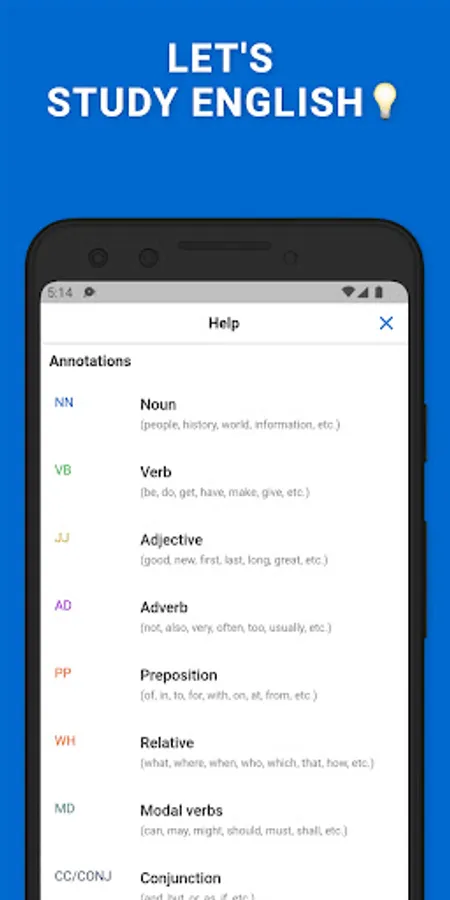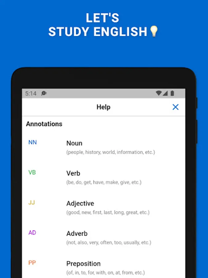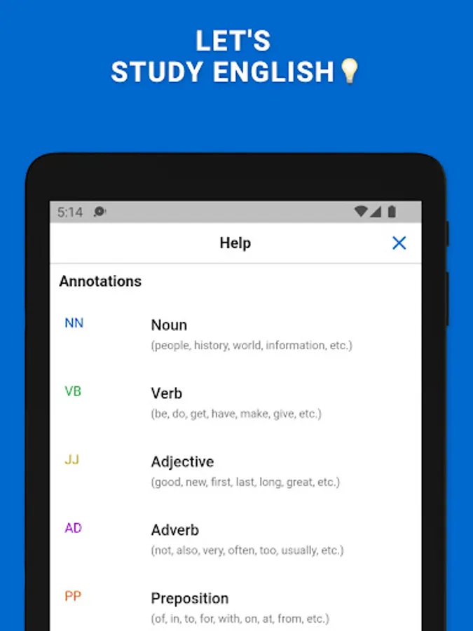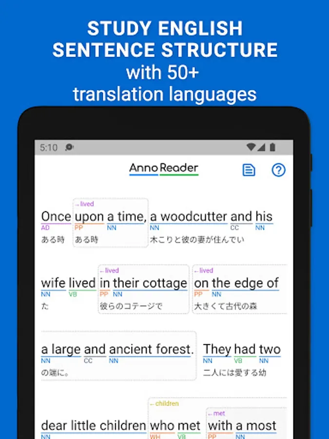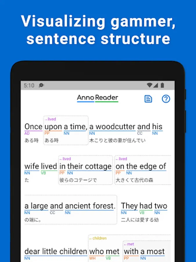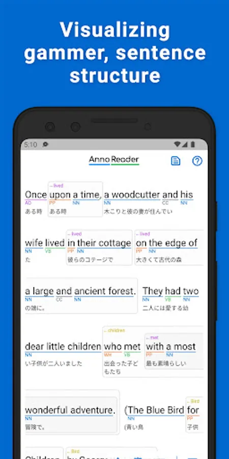 This tool visualizes English sentence structure, such as nouns, verbs, clauses, and phrases, by adding various annotations to make a text more readable.