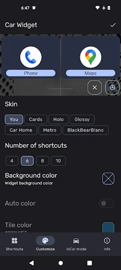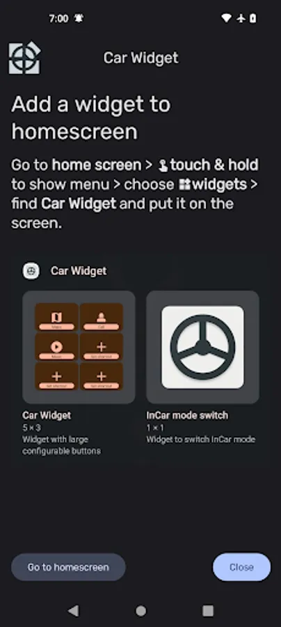 With the widget you can assign one or more screens on your home launcher to be dedicated for usage inside the car.