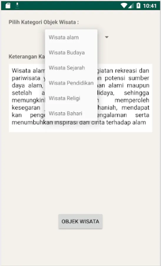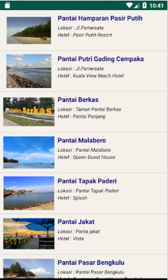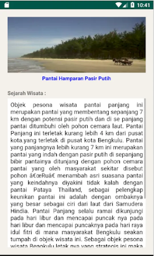 This application was made so that people can find out information on tourist attractions in the city of Bengkulu. Where on this application the tourist object has been divided into several parts, namely Nature Tourism Objects, Cultural Tourism Objects, Historical Tourism Objects, Educational Tourism Objects, Religious Tourism Objects, Marine Tourism Objects.