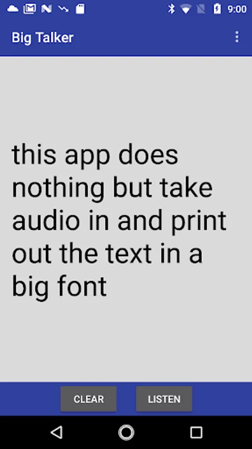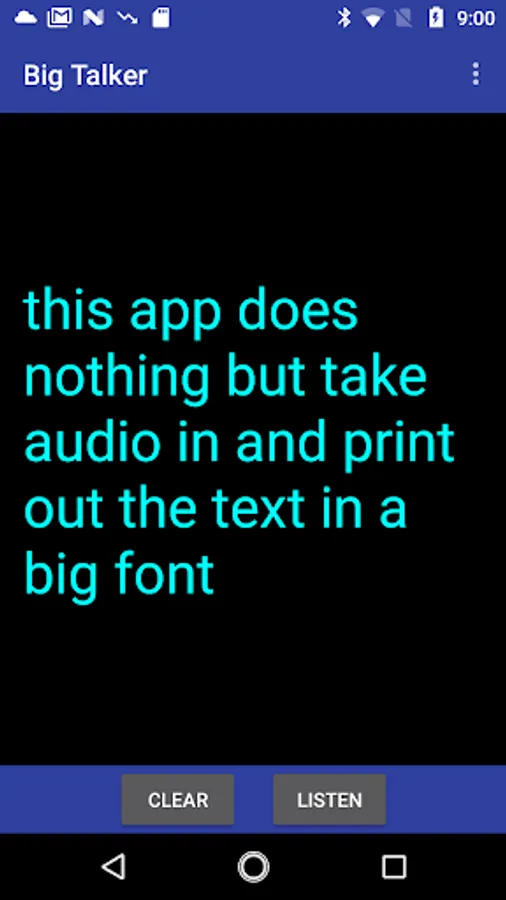 A very straightforward app that simply transcribes what's spoken to it. The resulting output is displayed in a large, easy to read, font. You can choose the high-contrast color theme you like best.