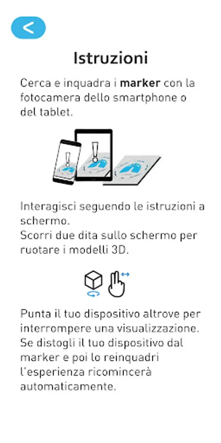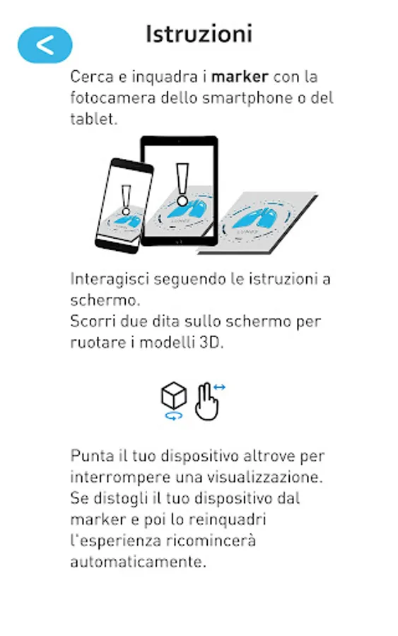 The technological experience of user experience is very simple: after downloading the App and its markers (these can be viewed on a PC screen, smartphone, tablet or printed paper), just open the App, follow the instructions in the initial tutorial , and frame the marker. Once the digital model has appeared, it will be possible to view their animations and related descriptions.