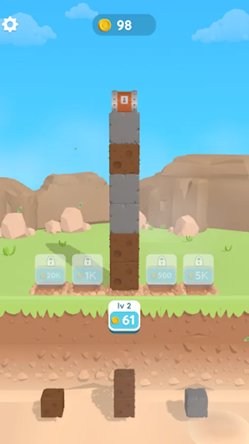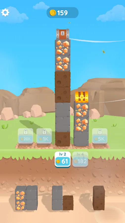 Place mine blocks on block towers. Match 3 of the same blocks and blast them! Collect gold and upgrade your mines!