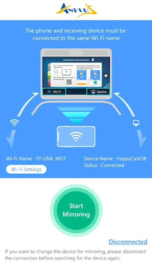 Anplus is an easy to use and a functional Screen Mirroring Application, with a simple way to mirror your videos, music and pictures from your phone to the display devices.