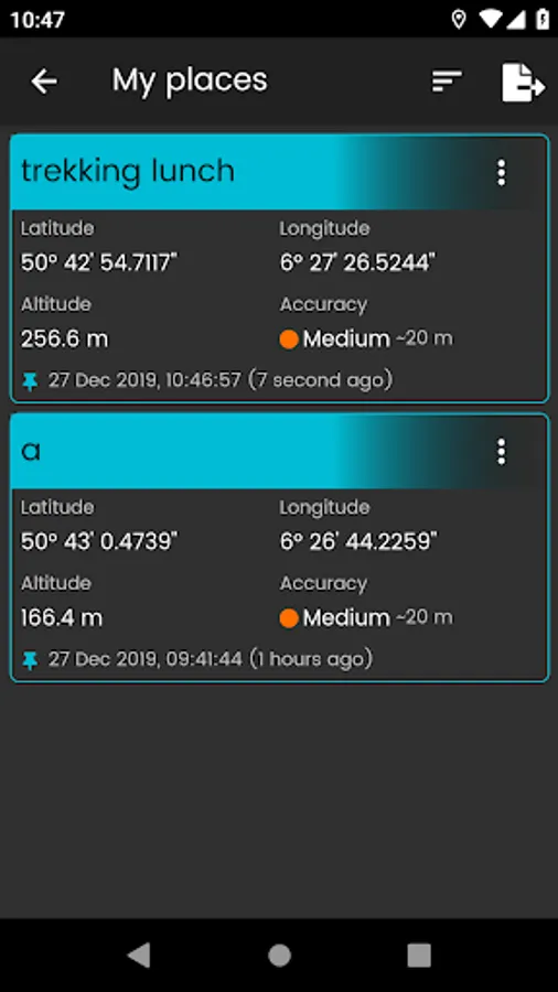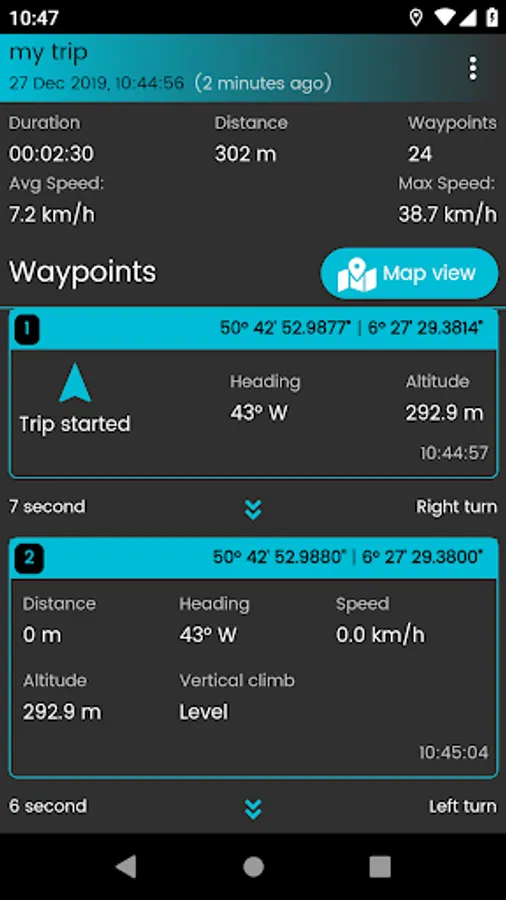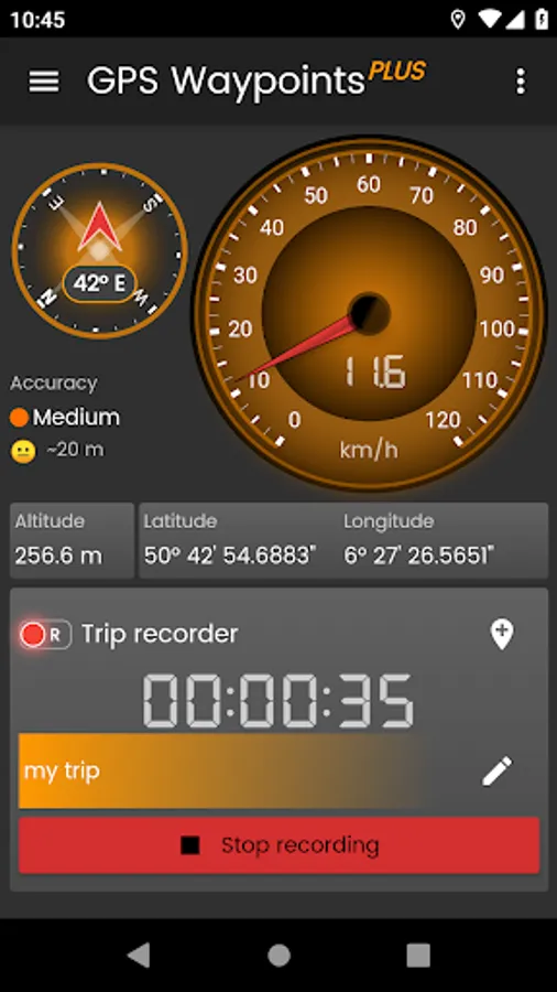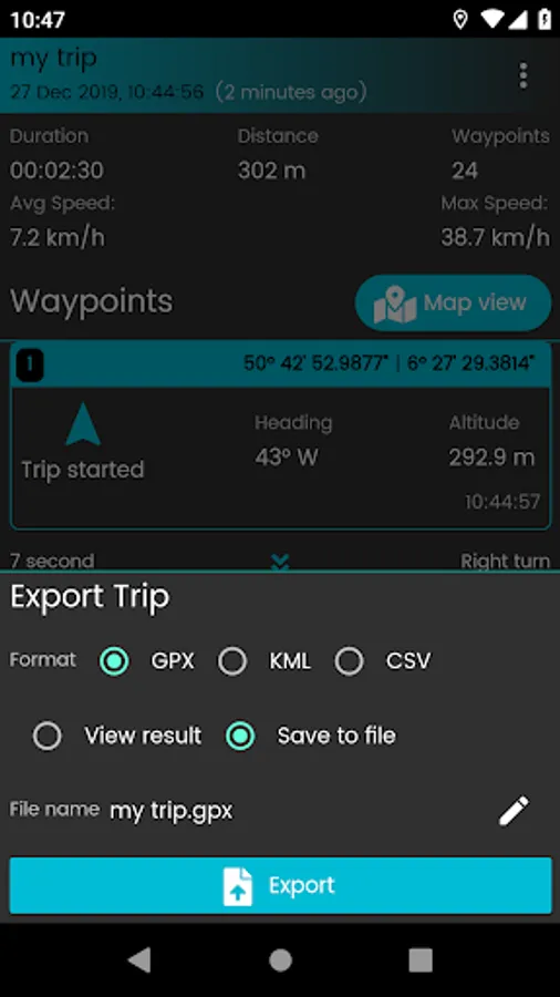 Waypoints helps you view and record your trip data like speed, GPS coordinates, altitude and directions in units and formats you can customize. When you record your trip, it keeps track of the GPS locations that you're passing along with other essential parameters. You can later export your trip to standard formats like GPX, KML and CSV to import them in other tools.