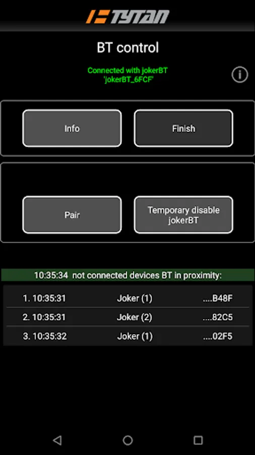TytanBT application is used for handling and pairing of jokerBT and remoteBT with DS410 radioBT connected to Tytan DS410 VSS or Tytan DS424 VSS (Vehicle Security System installed in vehicle).