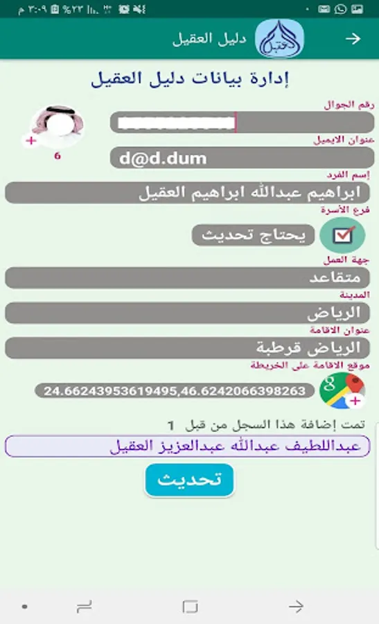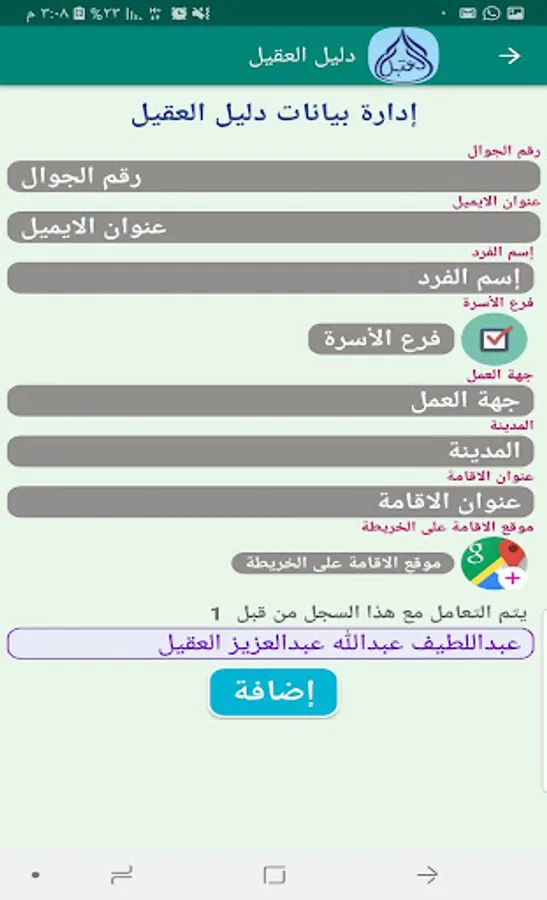 This application is for members of the family of Al Aqeel Al Ashraf in Najd and the central region and no other person has the right to install and operate it, and it was developed to achieve its goals which is to enhance communication between family members by providing a central directory of their addresses available on the Internet that is easy to view, search, update, download, print and add names And the addresses of those who wish to do so, whose name has not been added yet.