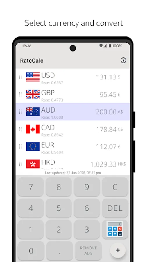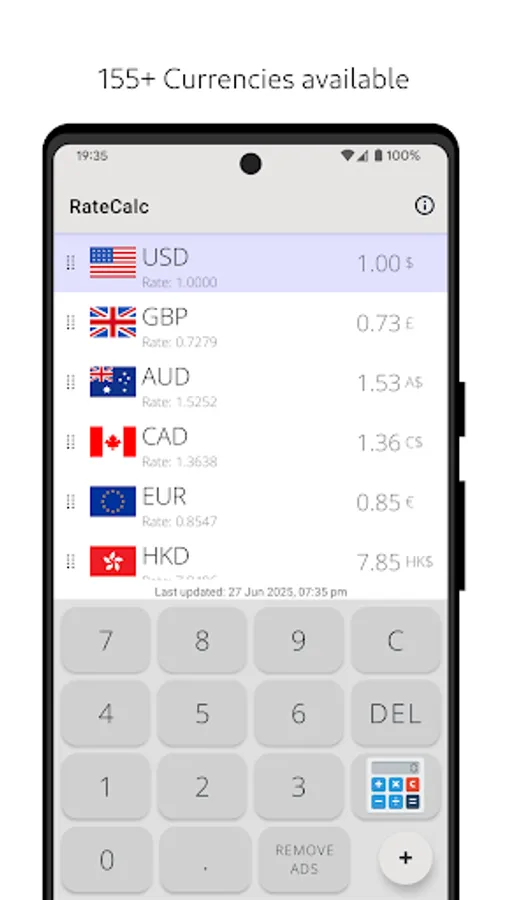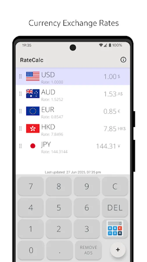 * **Customizable Currency List:** Tailor RateCalc to your needs. Easily add your preferred currencies and reorder them with a simple drag-and-drop for quick access.