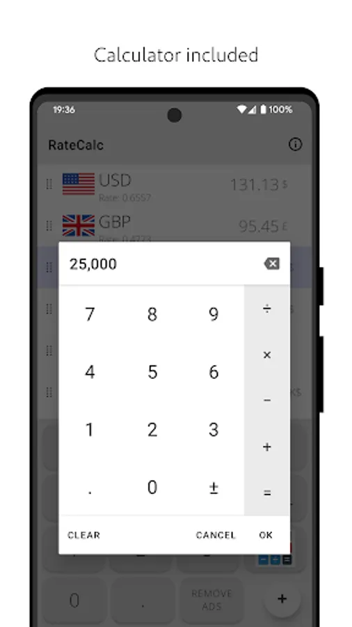 * **Intuitive Currency Calculator:** Effortlessly perform calculations. Enter an amount in one currency, and RateCalc instantly displays its equivalent across your entire personalized list.