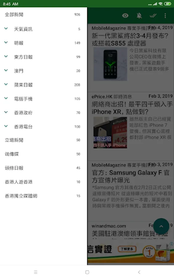 Hong Kong News collects news and information from RSS feed and deliver latest information in one app.
